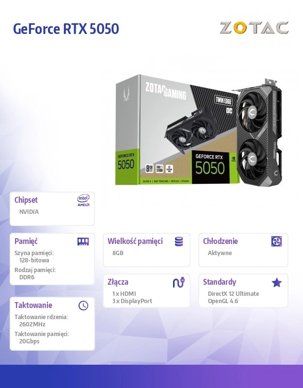 ZOTAC GAMING GeForce RTX 5050 Twin Edge OC je navrhnutá pre hráčov, ktorí hľadajú kompaktnú, no výkonnú grafickú kartu. Moderná architektúra NVIDIA Blackwell a technológia DLSS 4 umožňujú vyššie snímkové frekvencie, čistejší obraz a plynulejšie hranie vo Full HD aj QHD.