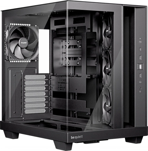 Light Base 500 Black prináša premyslený airflow s uhlovým, výsuvným rámom ventilátorov, ktorý smeruje chladiaci vzduch priamo na GPU. Ventilátory možno osadiť do zníženej vane pre ideálne napojenie na dno skrine, zatiaľ čo kanál pre kabeláž udržiava vnútro čisté a prehľadné. Štyri tiché ventilátory Pure Wings 3 120 mm PWM sú optimalizované na vysoký prietok a nízku hlučnosť – bočné jednotky s obrátenými lopatkami navyše vyzerajú skvelo cez perforáciu.