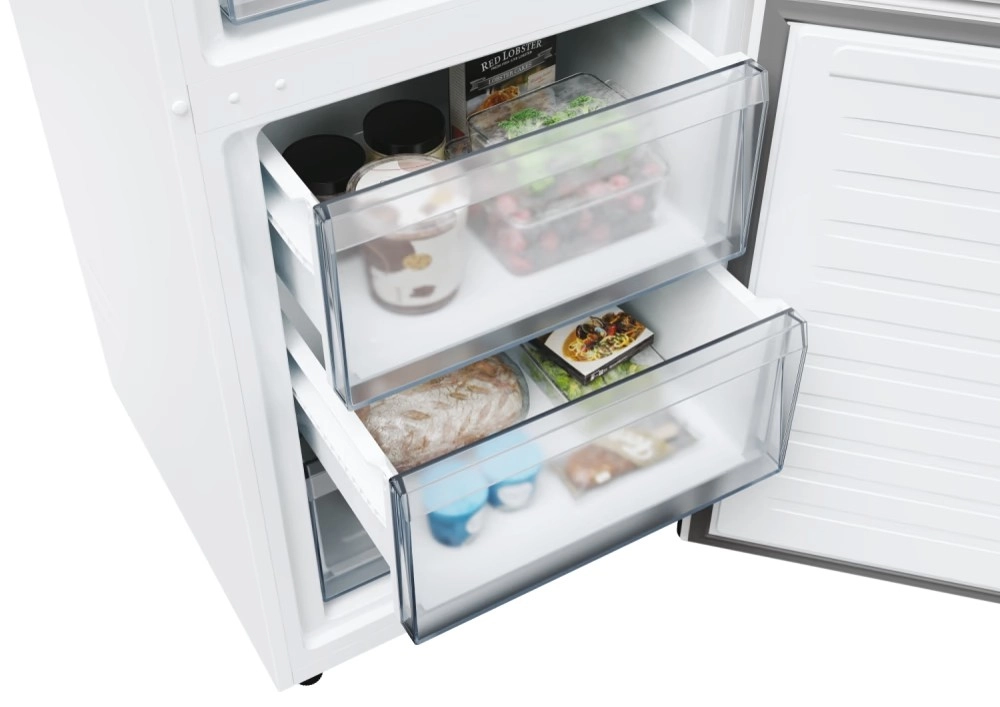 Tri priestranné a priehľadné zásuvky v mrazničke umožňujú rýchlu orientáciu aj ukladanie objemnejších balení bez zbytočného hľadania.