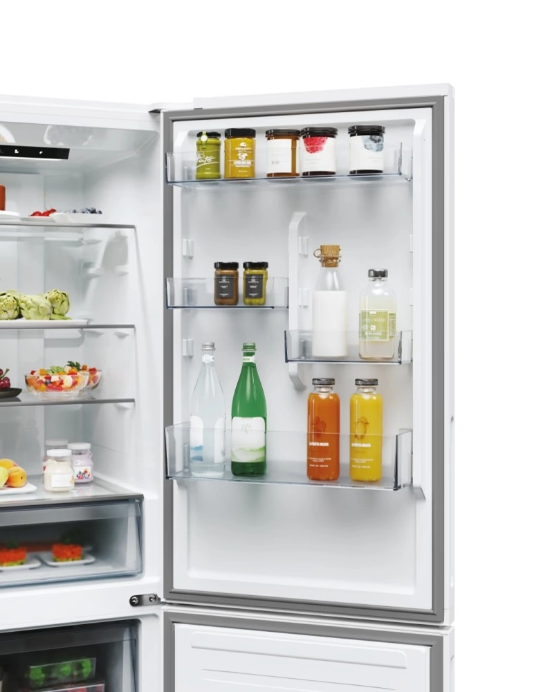 Táto voľne stojaca chladnička s mrazničkou dole kombinuje čistý minimalistický dizajn s premyslenou vnútornou organizáciou. Priehľadné boxy a nastaviteľné police umožnia prehľadné uloženie nápojov, ovocia, zeleniny aj hotových jedál, zatiaľ čo jasné LED svetlo zaistí perfektnú viditeľnosť v každom rohu.