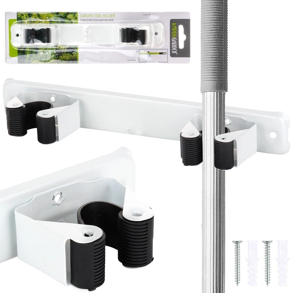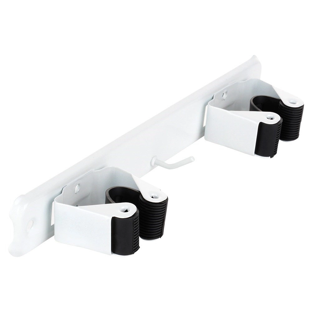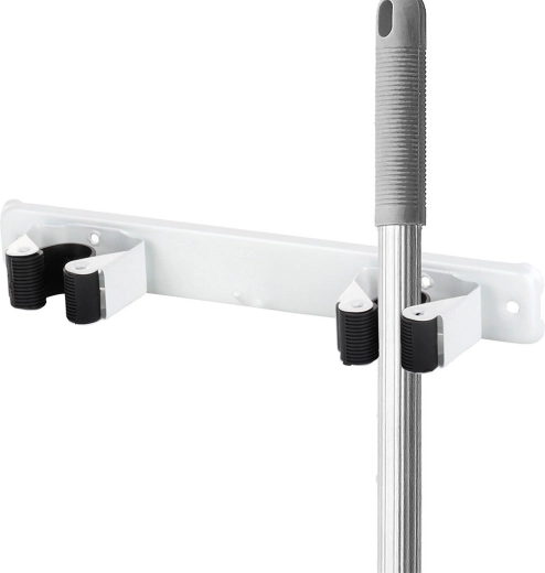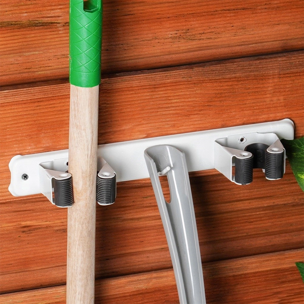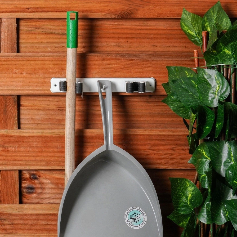 Praktický nástenný držiak pomôže prehľadne uložiť upratovacie aj záhradné náradie a ušetrí cenné miesto na podlahe. Dva samosvorné úchyty s pogumovanými valčekmi pevne zovrú násady mopu, metly či hrabie, zatiaľ čo stredový háčik je ideálny na utierku, rukavice alebo kefku. Vďaka pevnej kovovej konštrukcii a univerzálnemu dizajnu je vhodný do kúpeľne, kuchyne, predsiene, technickej miestnosti, altánku aj garáže.
