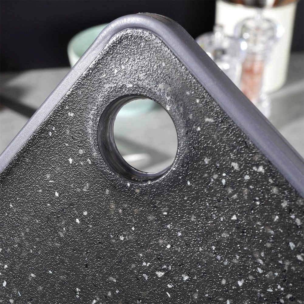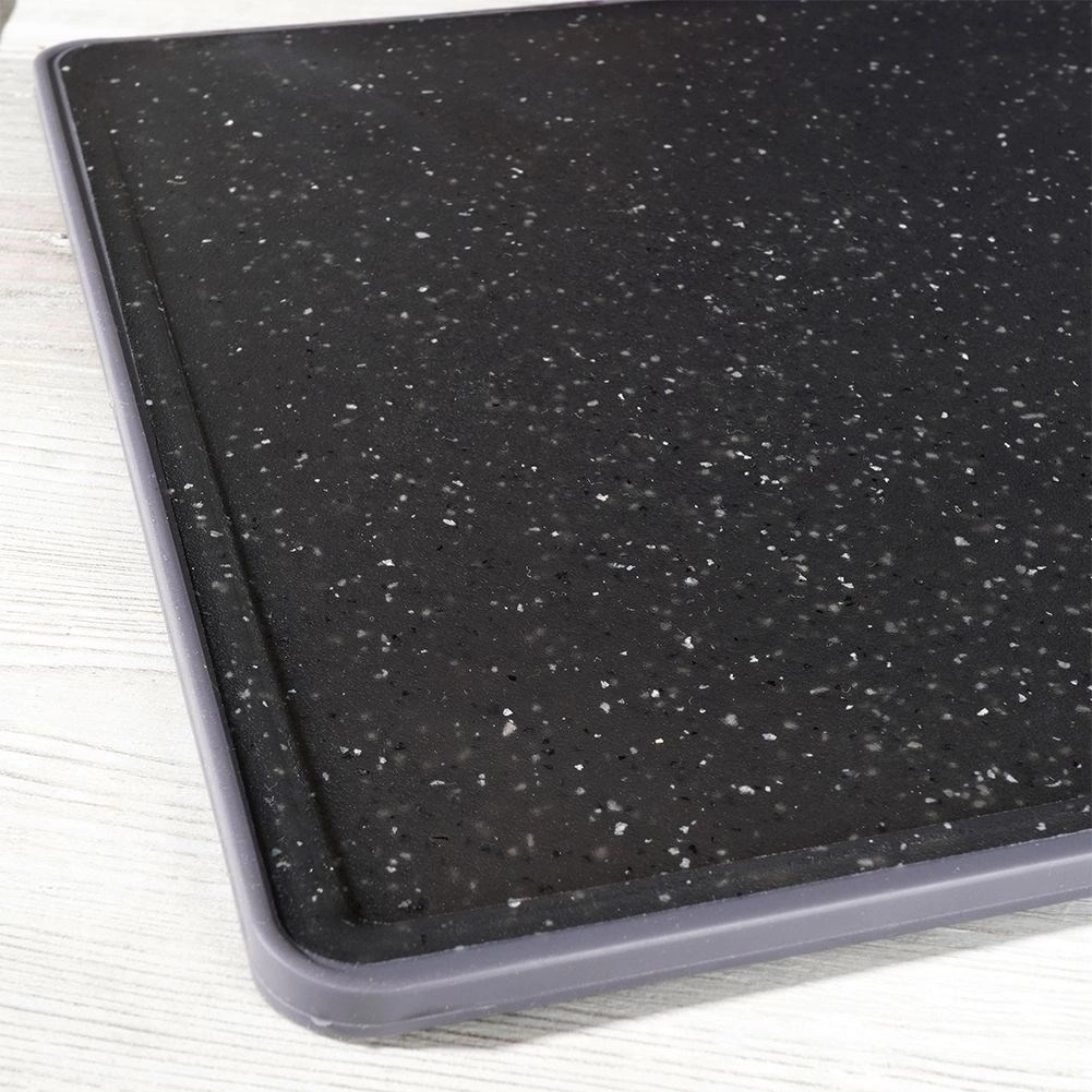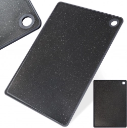 Odolná kuchynská doska z plastu v čiernom granitovom dizajne na každodenné krájanie. Má rozmery 33 × 23 cm, hrúbku 0,5 cm, protišmykové okraje, drážku na šťavy a otvor na zavesenie. Je hygienická, nepohlcuje pachy, šetrí pracovnú dosku a možno ju umývať v umývačke.