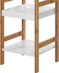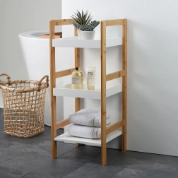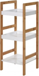 Elegantný a kompaktný bambusový kúpeľňový regál s tromi policami s rozmermi 30 × 30 × 72 cm šetrí miesto a prináša poriadok do malej aj väčšej kúpeľne. Kombinácia prírodného bambusu a bielych políc pôsobí moderne a nadčasovo. Vďaka odolnosti voči vlhkosti je ideálny na uloženie kozmetiky, uterákov a doplnkov. Ľahká konštrukcia, praktické 3 úrovne a univerzálny dizajn pre kúpeľňu aj ďalšie miestnosti.