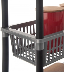 Regál je vyrobený z ľahkej a odolnej plastovej konštrukcie, ktorá je odolná voči vlhkosti a ľahko sa čistí. Rýchla montáž bez zložitých nástrojov; v prípade potreby možno košíky zasunúť do seba a regál kompaktne uskladniť.