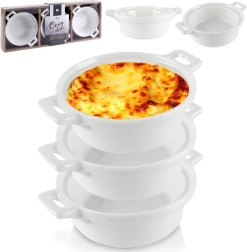Sada 3 okrúhlych zapekacích misiek z kvalitného bieleho porcelánu elegantne doplní každú kuchyňu aj prestretý stôl. Vďaka kompaktnej veľkosti (cca 13 × 10 × 4 cm) a objemu 130 ml sú ideálne na pečenie a servírovanie jednotlivých porcií, od dezertov po zapekané prílohy.
