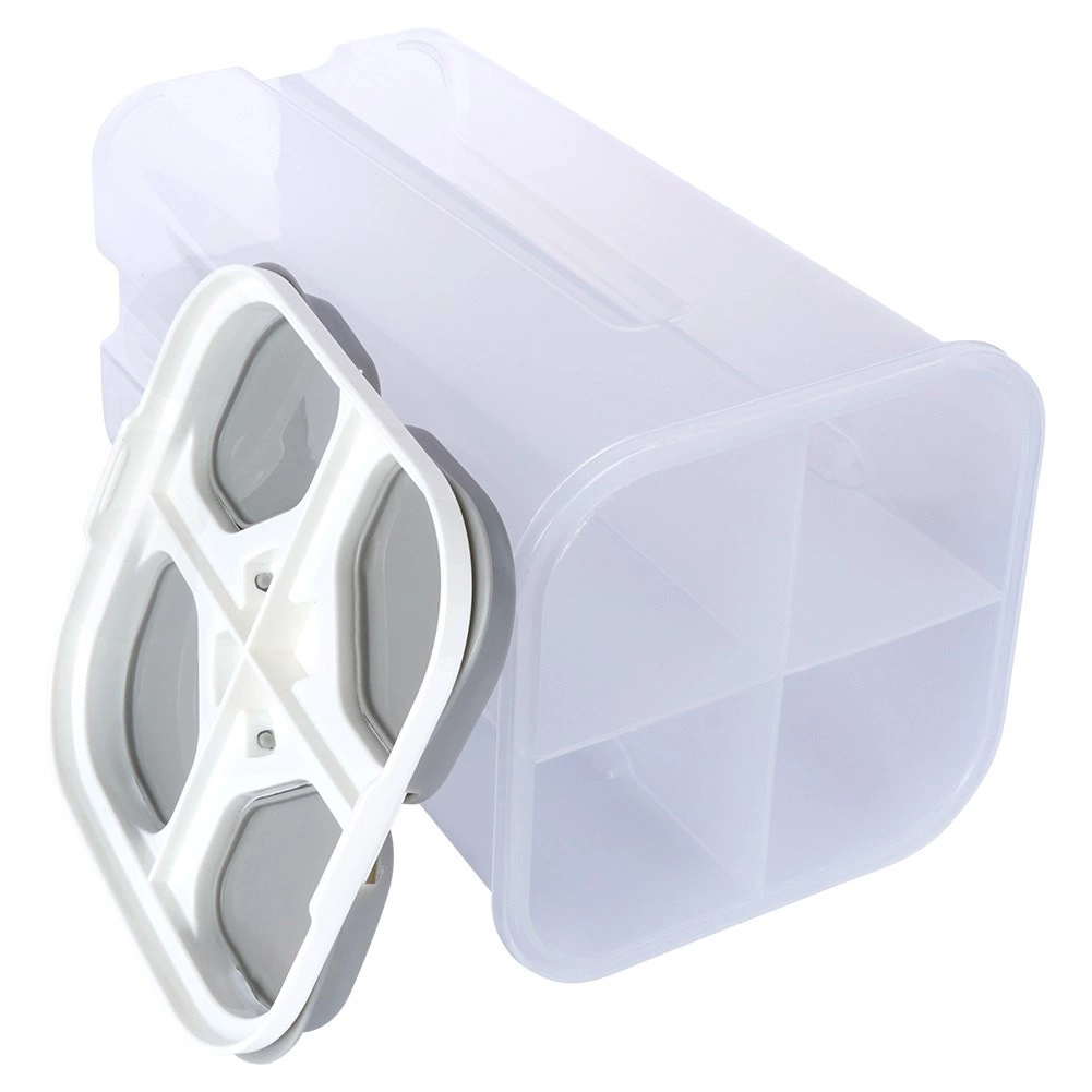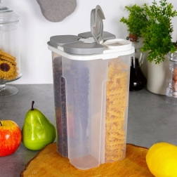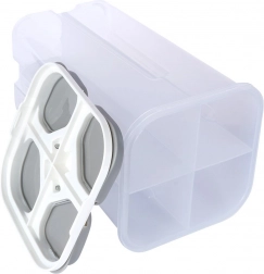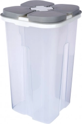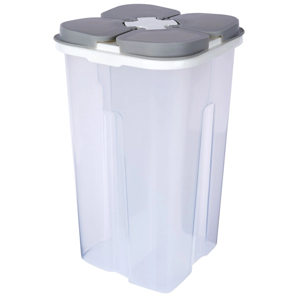 Usporiadajte svoju špajzu s chytrým zásobníkom s objemom 2,4 litra, ktorý má štyri samostatné komory (každá cca 600 ml) a nezávislé výklopné dávkovače. Priehľadné steny z odolného plastu umožnia rýchlu kontrolu stavu zásob bez nutnosti otvárať nádobu. Veko s viacerými zónami a tesnením spoľahlivo chráni obsah pred vlhkosťou a nečistotami.