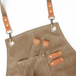 Premyslená konštrukcia s krížovými popruhmi na chrbte rovnomerne rozkladá hmotnosť a drží zásteru bezpečne na mieste. Predné dvojité vrecko a menšia priehradka pojmú kuchynské aj pracovné drobnosti, zatiaľ čo dve pútka sú ideálne na ceruzku či nástroj.