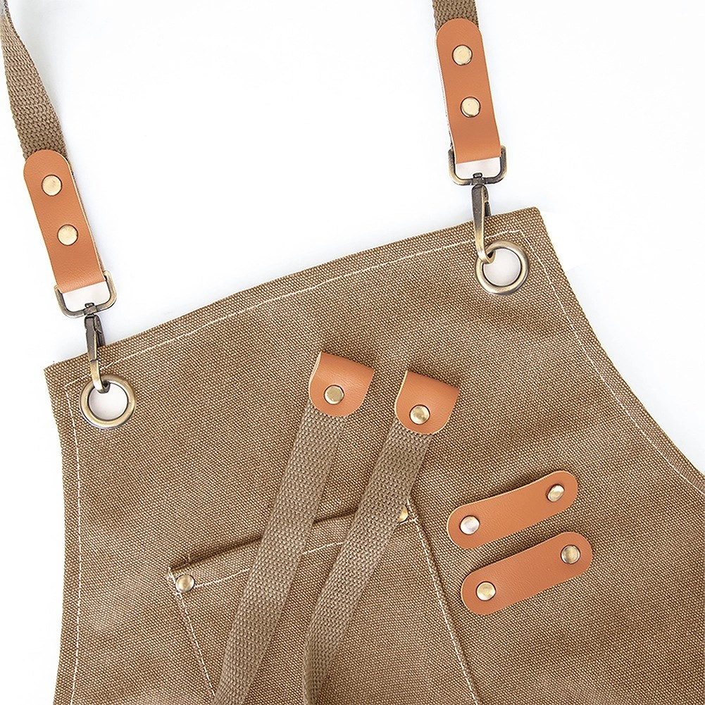 Odolné plátno so zosilneným šitím, kovové očká a koženkové prvky pre dlhú životnosť v kuchyni aj dielni.