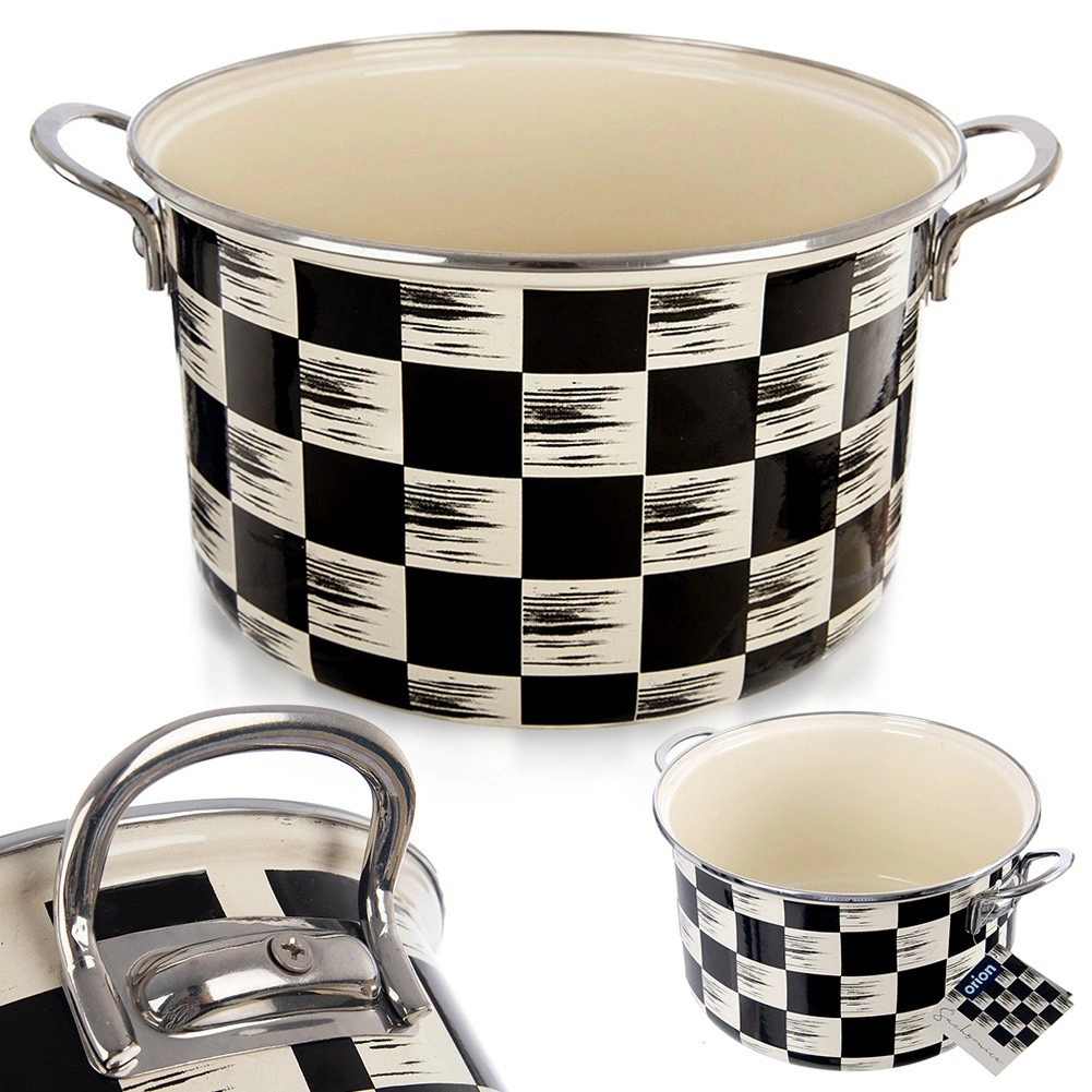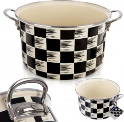 Štýlový smalťovaný hrniec s objemom 6,5 l a priemerom 26 cm v dizajne čierno-béžovej šachovnice. Vyrobený z kvalitnej smaltovanej ocele s nerezovým lemom a kovovými úchytmi pre bezpečné uchopenie. Vhodný na všetky typy sporákov vrátane indukcie, do rúry aj do umývačky riadu – ideálny na varenie polievok, omáčok aj dusených jedál.