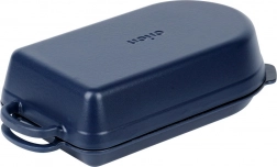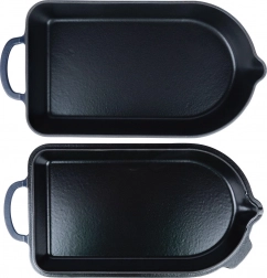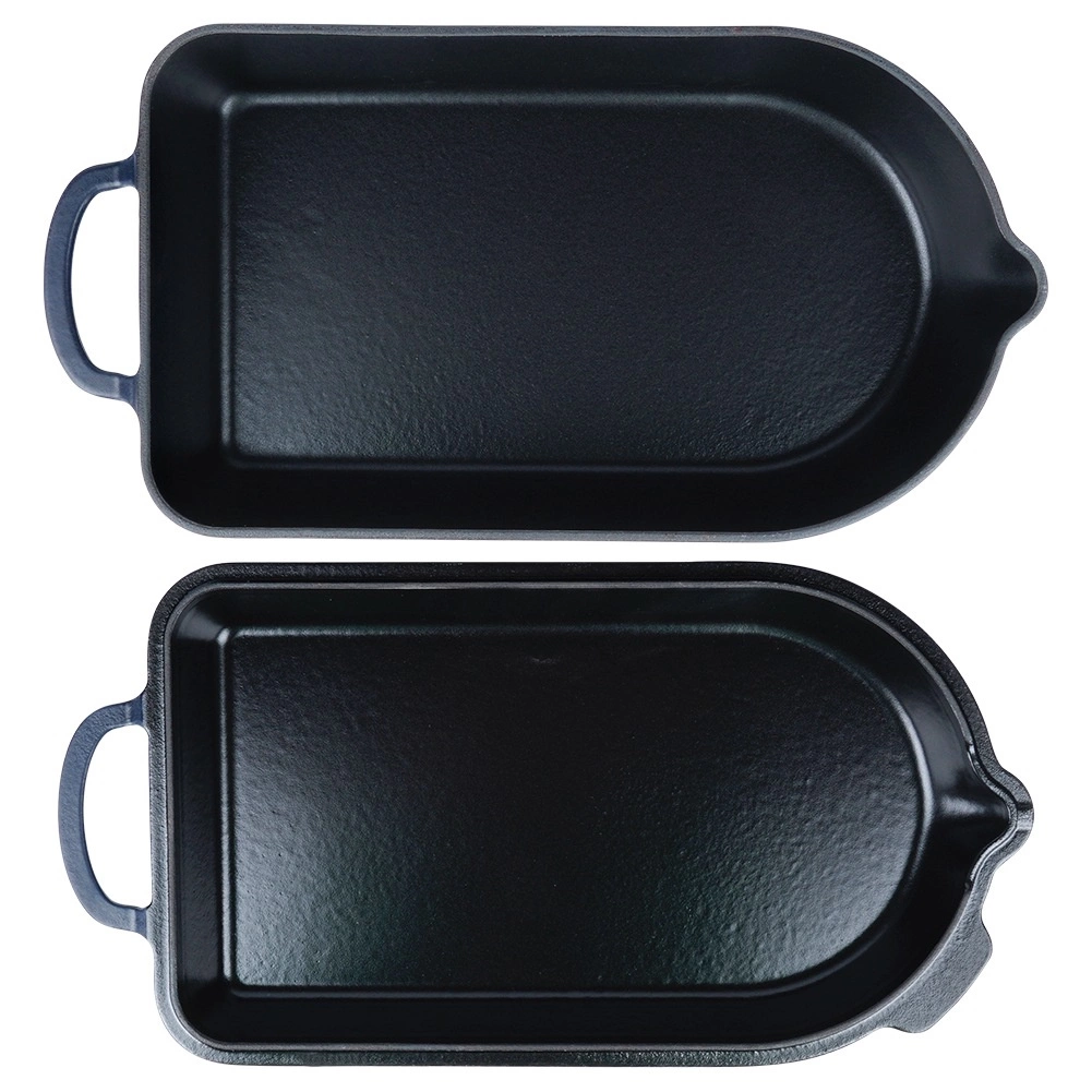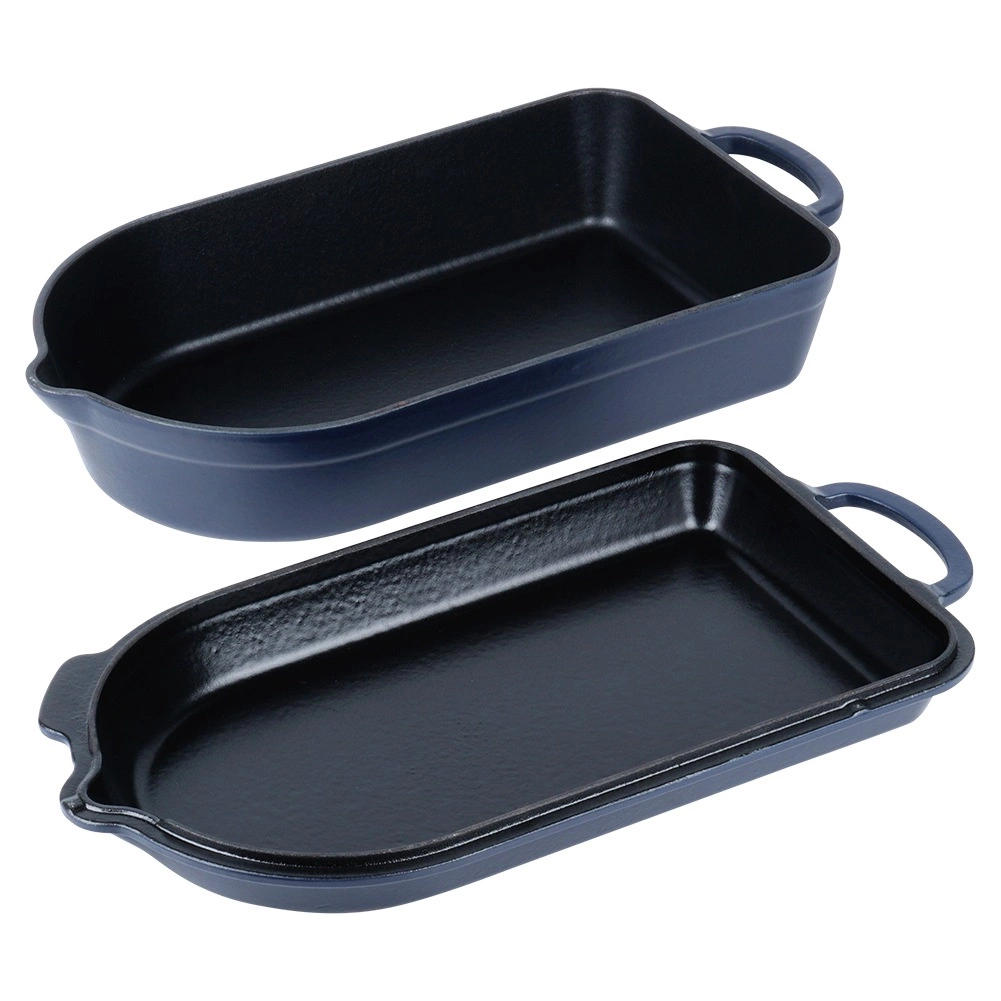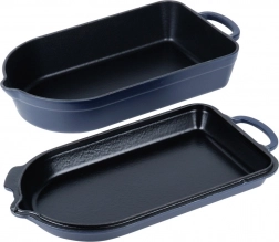 Vnútorný čierny smalt uľahčuje smaženie, zapekanie aj údržbu, vonkajšia tmavomodrá glazúra dodáva elegantný vzhľad na servírovanie priamo na stôl. Nádobie je vhodné na plynové, elektrické, sklokeramické, halogénové aj indukčné dosky a do rúry do 250 °C. Obe časti majú praktické výlevky na ľahké zliatie šťavy a bezpečné rukoväte na pohodlný prenos.