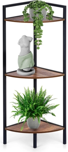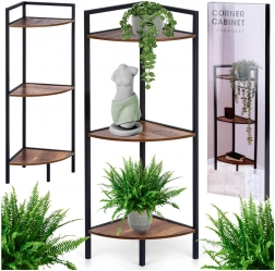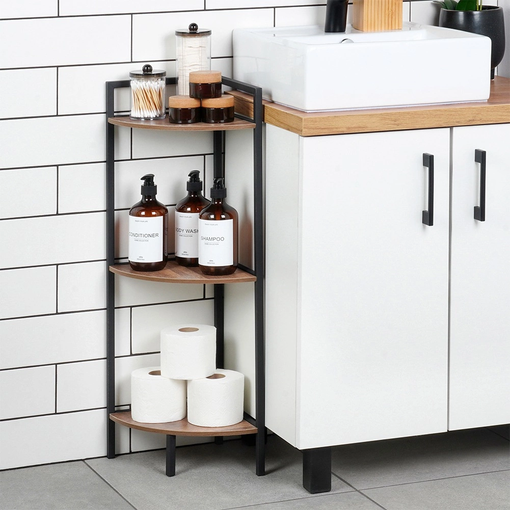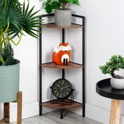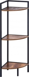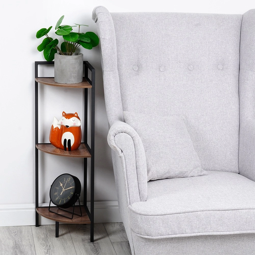 Elegantný rohový regál s tromi policami šetrí miesto a ponúka praktické vertikálne úložisko pre dekorácie, knihy či kozmetiku. Stabilná kovová konštrukcia v čiernej farbe a police z MDF v dekore dreva sa hodia do každého interiéru. Vďaka pravému uhlu 90° perfektne prilieha do kúta a univerzálne využitie nájde v obývačke, kuchyni aj kúpeľni.