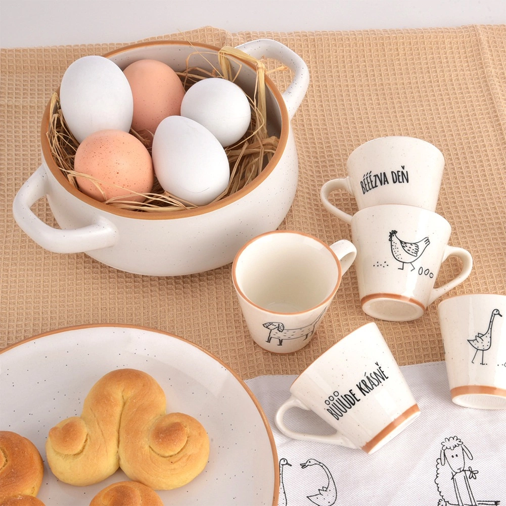 Odolná keramika v bielej farbe s hnedým lemom a škvrnitým povrchom vynikne na každom stole.
