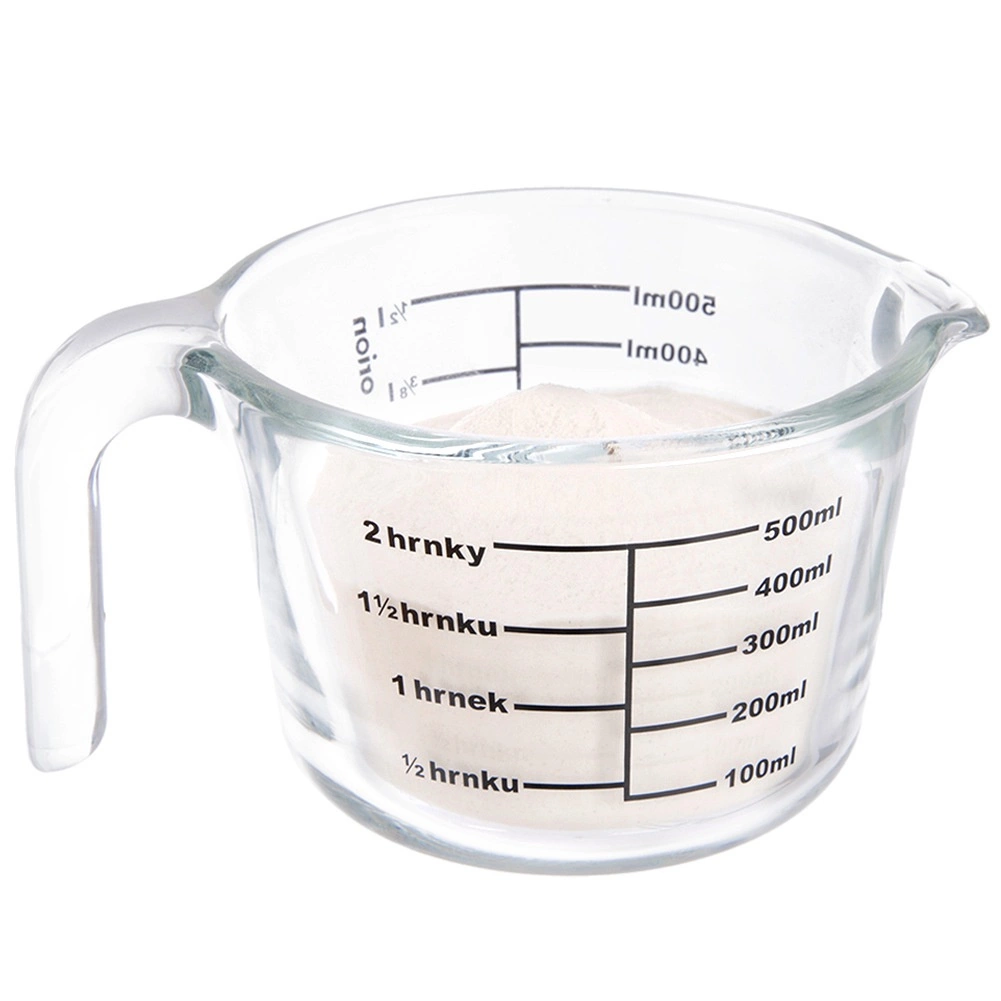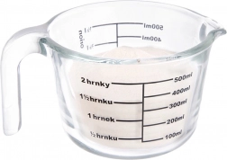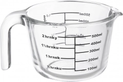 - Presná a prehľadná stupnica v ml (100–500 ml po 100 ml), litroch (1/8 l až 1/2 l) a šálkach (1/2 až 2).