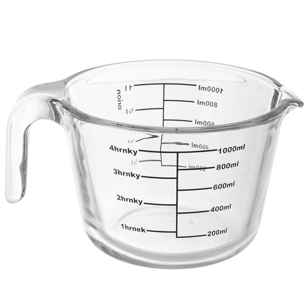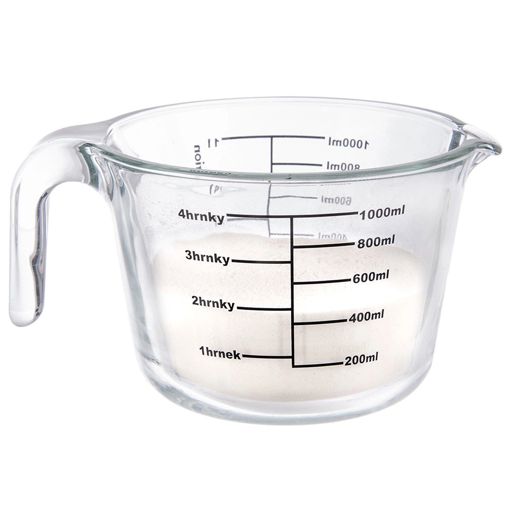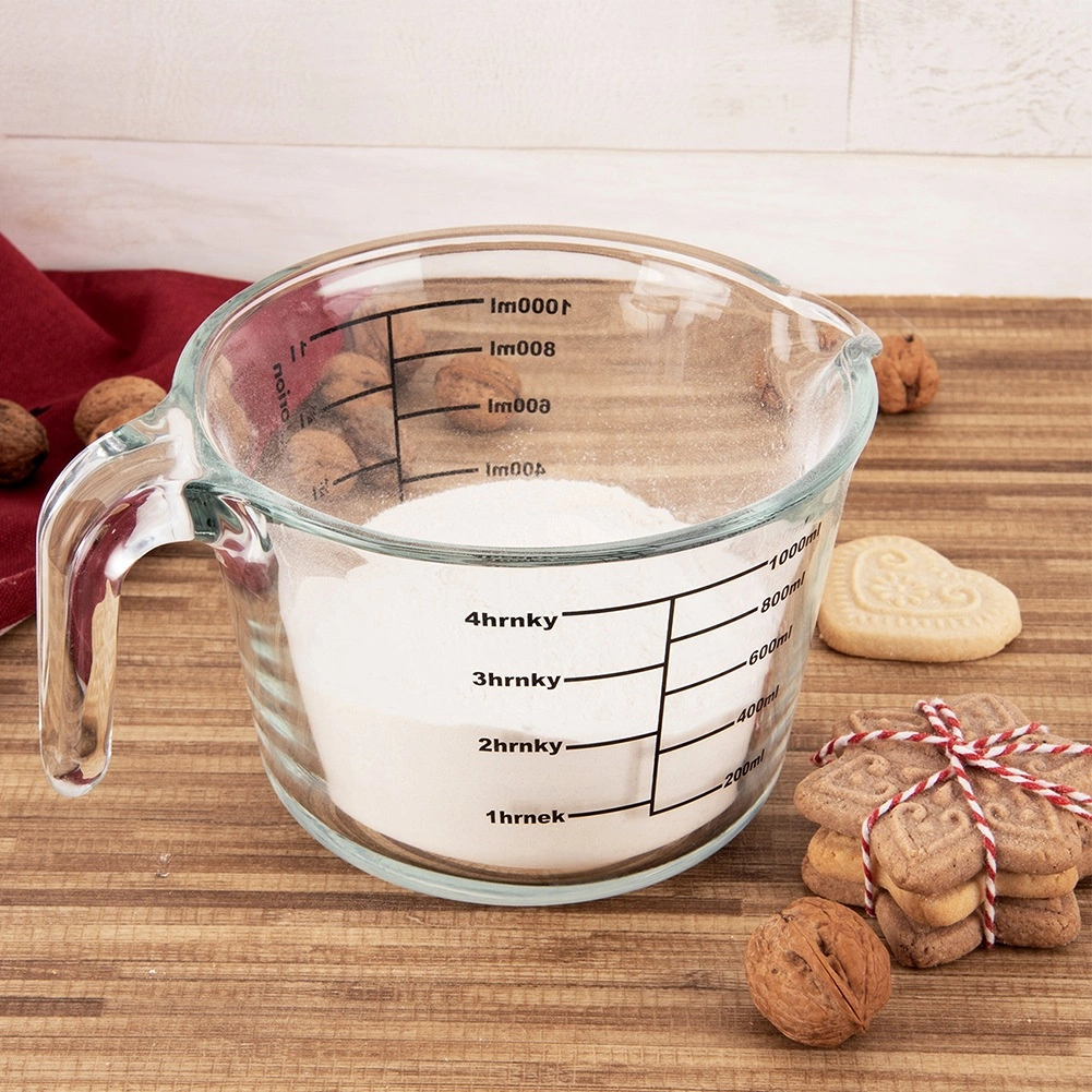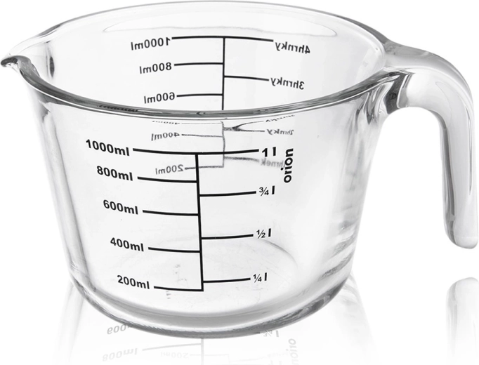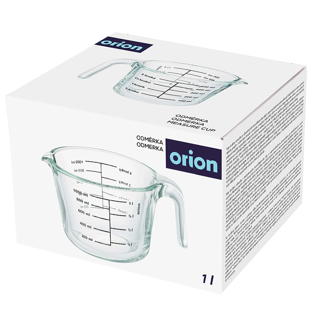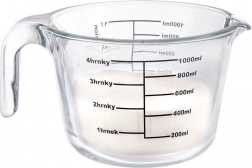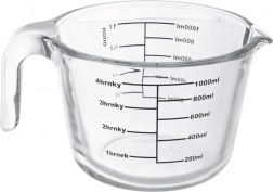 Odmerka meria v mililitroch od 200 do 1000 ml (po 200 ml), v litroch od 1/4 l do 1 l a v šálkach od 1 do 4. Odolné borosilikátové sklo zvláda extrémne teplotné rozdiely, takže odmerku môžete dať do chladničky, mikrovlnky aj rúry.