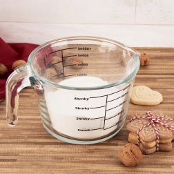 Táto odmerka z kvalitného borosilikátového skla je skvelým pomocníkom na presné meranie tekutých aj sypkých surovín. Vďaka ergonomickému uchu a praktickému zobáčiku budete ingrediencie prelievať bez kvapiek a neporiadku. Čierne vyznačená stupnica zabezpečuje jednoduchú čitateľnosť pri varení aj pečení.