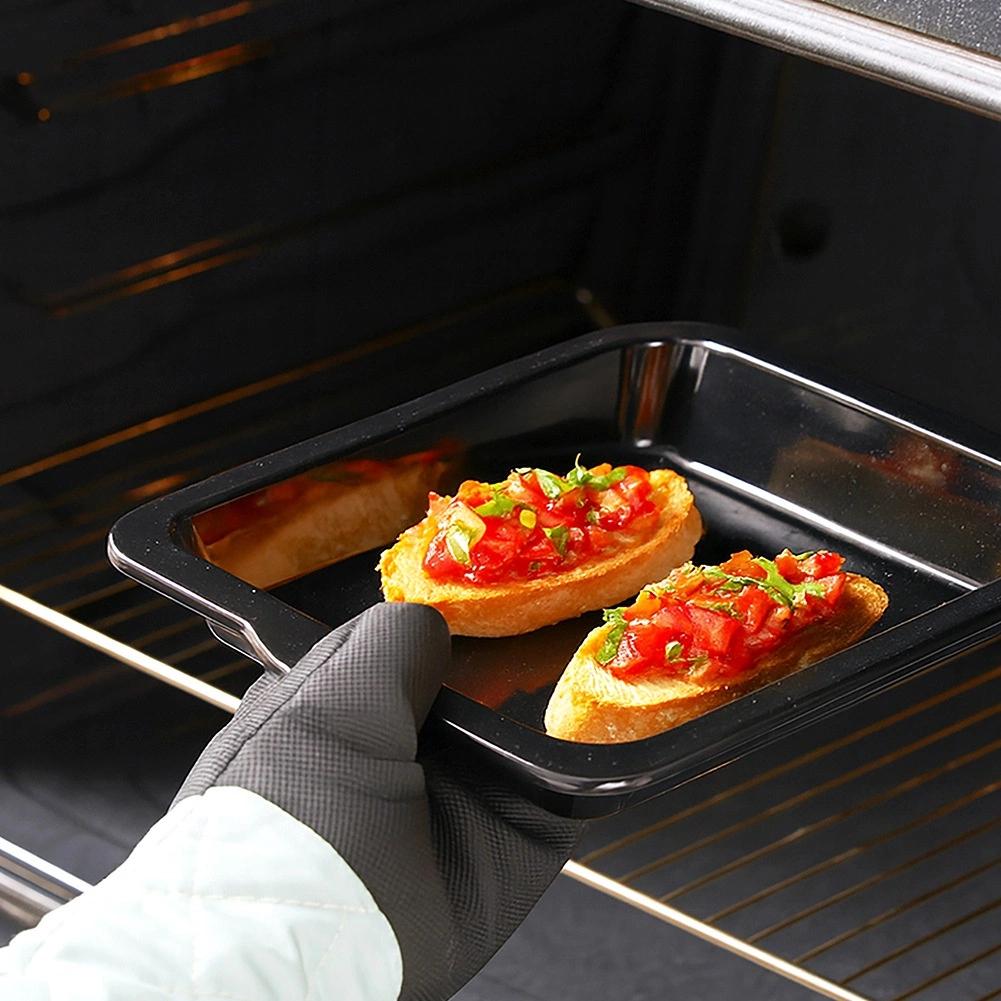 Vyššie okraje 5 cm zabraňujú vytekaniu štiav a omáčok, čo uľahčuje manipuláciu a bezpečný presun plechu. Univerzálny rozmer sa zmestí do väčšiny domácich rúr a poskytuje spoľahlivý výkon pri každodennom používaní.