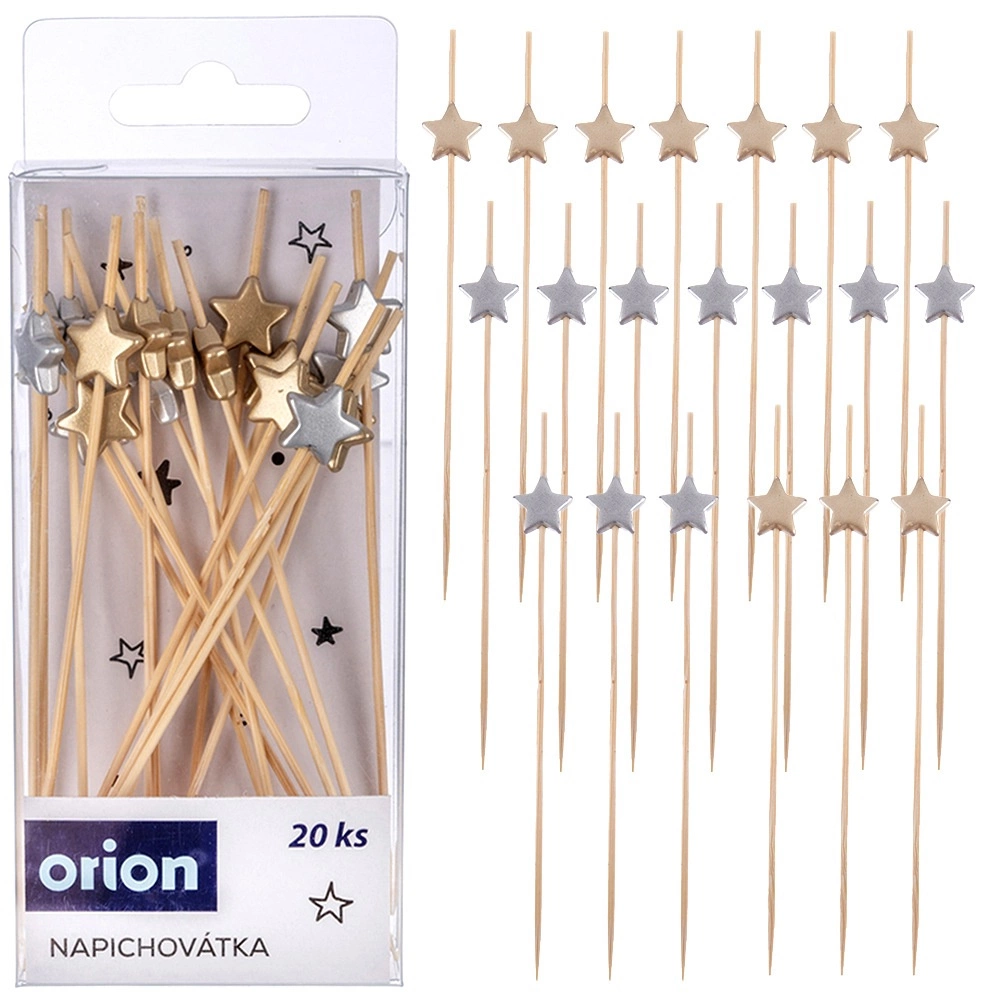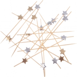 Oživte servírovanie občerstvenia pomocou dekoratívnych špajdlí s hviezdičkami. Prírodný bambus v kombinácii s drevenou ozdobou v zlatom a striebornom prevedení sa postará o atraktívnu prezentáciu aj pohodlné napichovanie. Každé balenie obsahuje 20 kusov v univerzálnej dĺžke 12 cm.