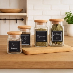 Udržte si poriadok v špajzi štýlovo. Čierne samolepiace štítky sa hodia na domáce zaváraniny, koreniny, sypké potraviny aj darčekové balenie. Laminovaný povrch je odolnejší voči nečistotám a každý štítok ponúka vyhradené miesto pre názov, zloženie či dátum.