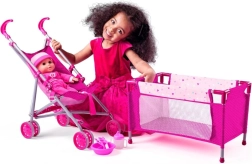 Táto krásna súprava obsahuje všetko, čo vaše dieťa potrebuje k starostlivosti o svoju obľúbenú bábiku. Súčasťou je športový kočík s kovovou konštrukciou, ktorý je veľmi praktický vďaka ľahkej manipulácii. Ďalej je priložená cestovná postieľka, ideálna na domáce aj vonkajšie hranie.