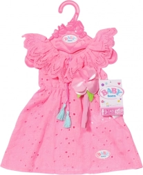 Šaty v ružovom odtieni s nariaseným golierikom, dekoratívnymi šnúrkami a strapcami vyčarujú nežný vzhľad každej bábiky BABY born.