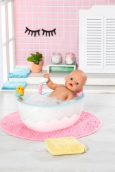 Sprchu možno nakloniť do vane, aby sa voda nerozstrekuvala mimo, a hadica sa dá vytiahnuť pre dôkladné osprchovanie bábiky. Striekaciu kačičku aj ružový vankúšik možno pripevniť na rôzne miesta po okraji vane – ideálne na kreatívne príbehy a rozvoj opatrovateľských zručností.