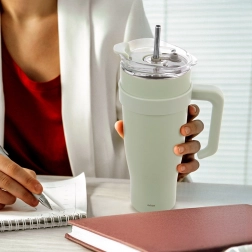 Praktický a odolný termo hrnček s užitočným objemom 1 l (max. 1,2 l) je navrhnutý na pohodlné každodenné pitie horúcich aj studených nápojov. Vákuová izolácia s dvojitou stenou udržiava stabilnú teplotu po mnoho hodín, zatiaľ čo pevné ucho a zúžené dno uľahčia prenášanie aj umiestnenie do držiakov v aute.