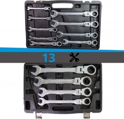 Táto univerzálna sada obsahuje 13 očkoplochých kľúčov s račňou v metrických rozmeroch 8–32 mm. Výklopné (flexibilné) račňové hlavice umožňujú nastavenie uhla a ľahký prístup k maticiam a skrutkám v obmedzenom priestore, napríklad v motorových priestoroch alebo strojových konštrukciách. Jemné ozubenie račne minimalizuje uhol spätného kroku a zrýchľuje prácu bez neustáleho skladania kľúča z upevňovacieho prvku.
