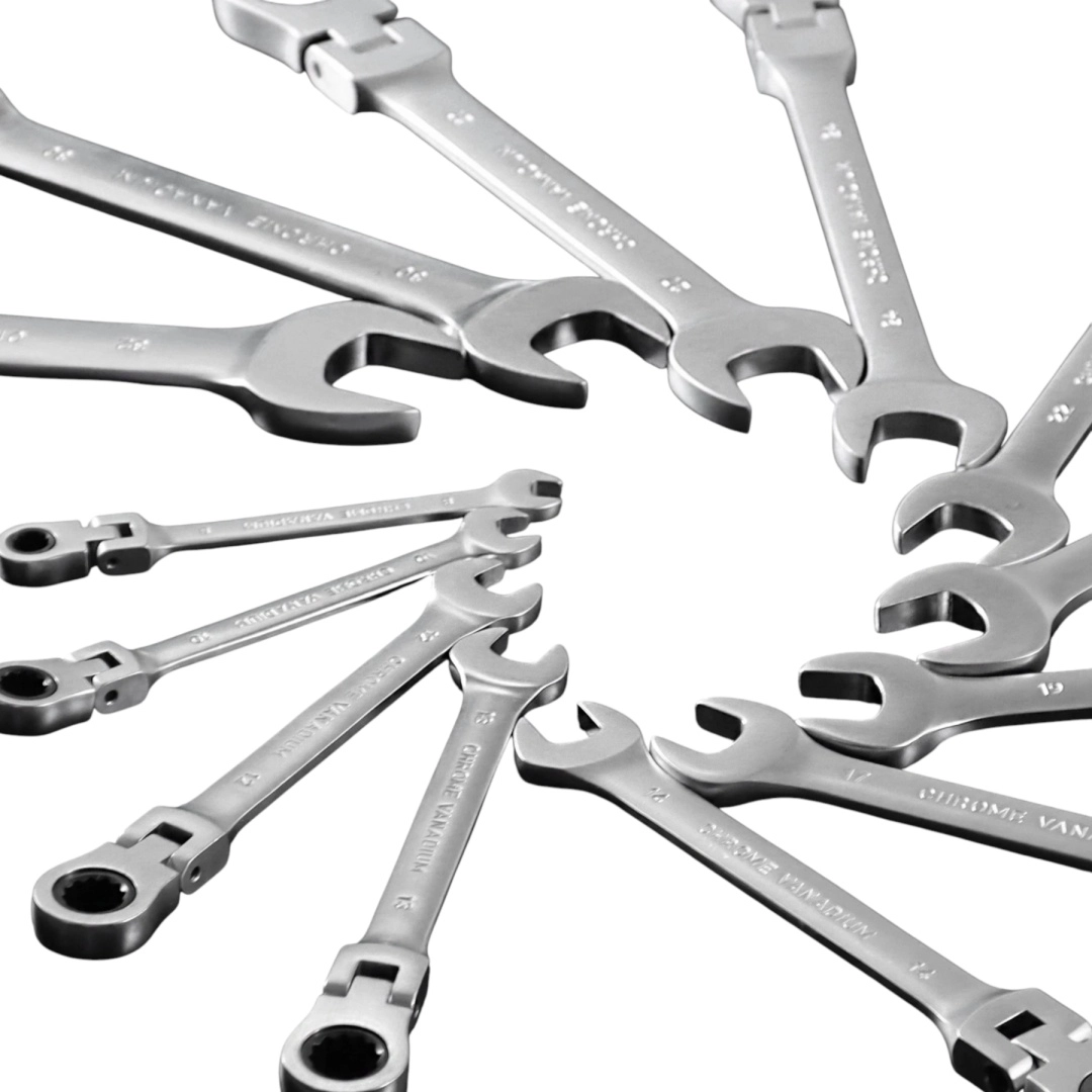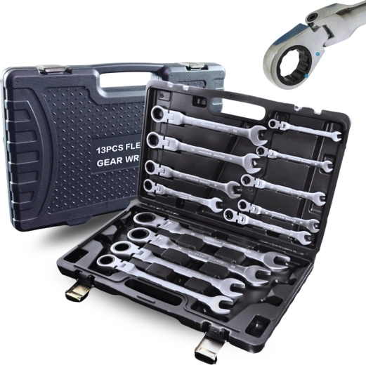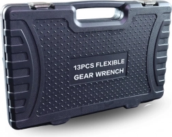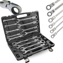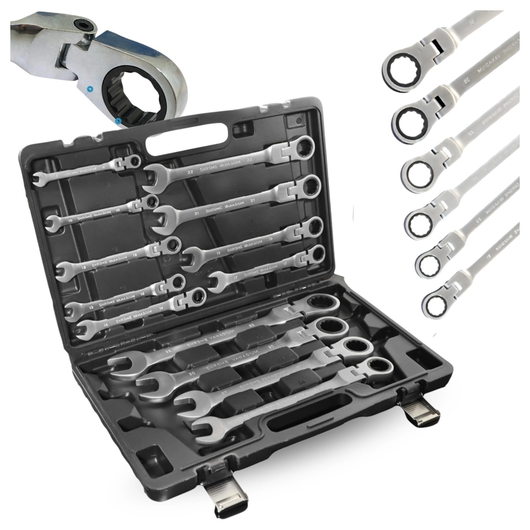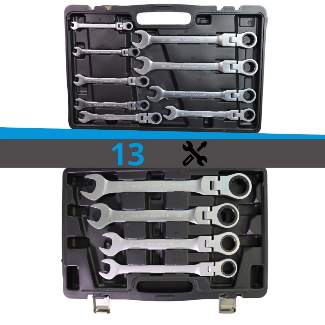 Profesionálna sada 13 flexibilných račňových kľúčov na rýchle uťahovanie a povoľovanie skrutiek aj v stiesnených priestoroch. Otočné kĺbové hlavy, jemný račňový mechanizmus a odolná chróm‑vanádiová oceľ (CrV) zaisťujú dlhú životnosť, presnosť a pohodlnú prácu. Súčasťou je pevný plastový kufor na bezpečné uloženie a prenos.