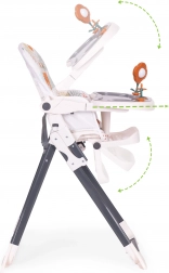 Praktická a bezpečná detská jedálenská stolička pre deti od 6 do 36 mesiacov s pevnou oceľovou konštrukciou, nastaviteľným pultíkom a podnožkou a 3-bodovým bezpečnostným pásom. Vďaka skladaciemu systému ju ľahko uložíte alebo vezmete na cesty. Súčasťou je odnímateľný poťah pre jednoduché čistenie, hrkálka a točiaca hračka na pulte a bezpečnostná medzinožná zarážka proti skĺznutiu. Maximálna nosnosť 15 kg.