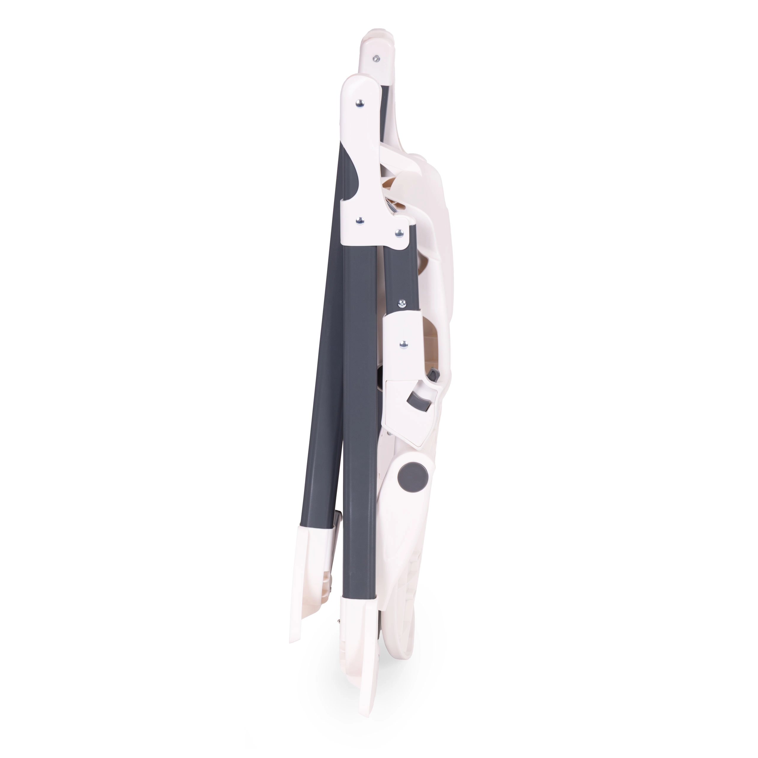 Stabilný oceľový rám, 3-bodové pásy a medzinožná zarážka držia dieťa v bezpečnej polohe. Nastaviteľný pultík aj podnožka sa prispôsobia rastu dieťaťa, takže zabezpečia pohodlie od 6 do 36 mesiacov. Skladacia konštrukcia šetrí miesto doma a uľahčuje transport.