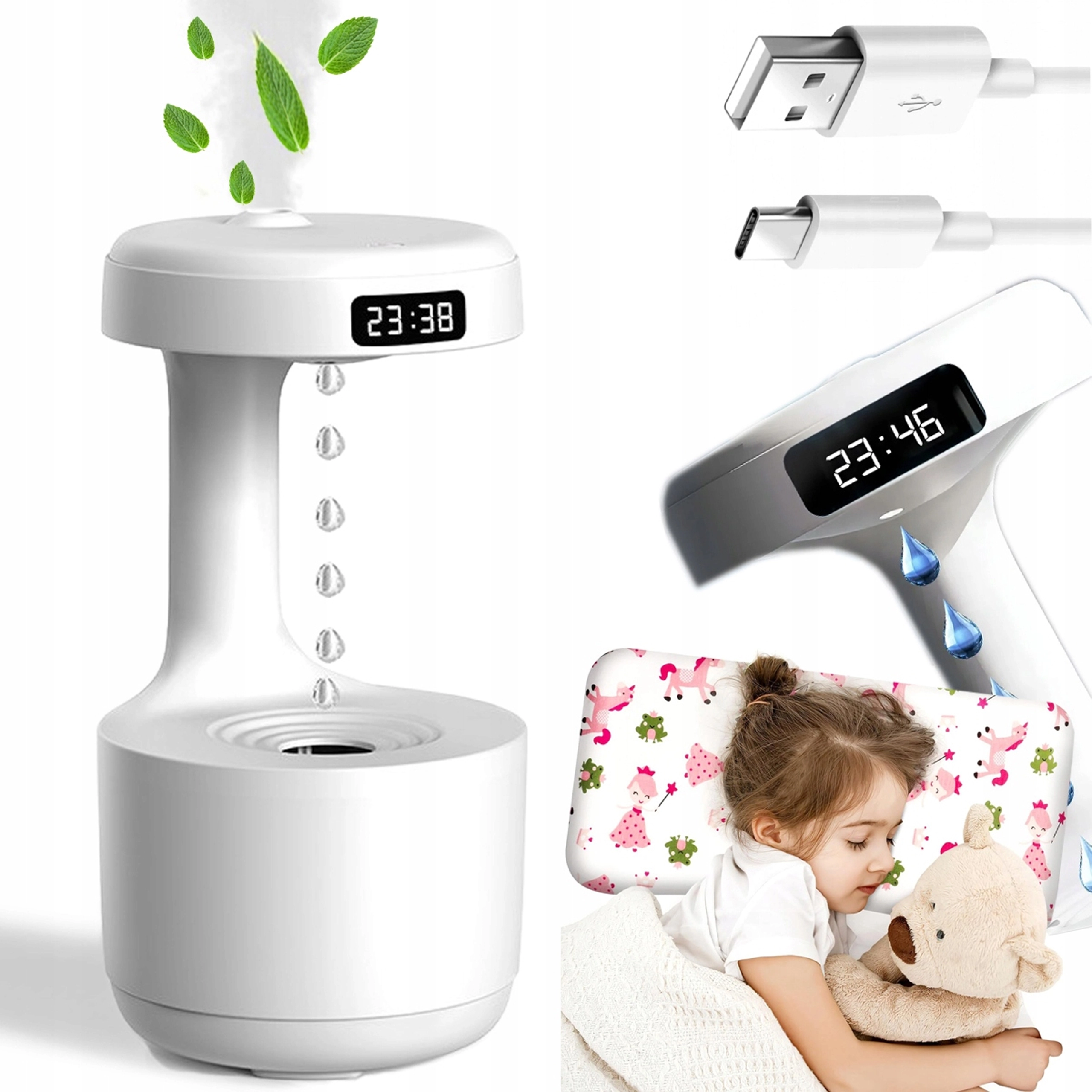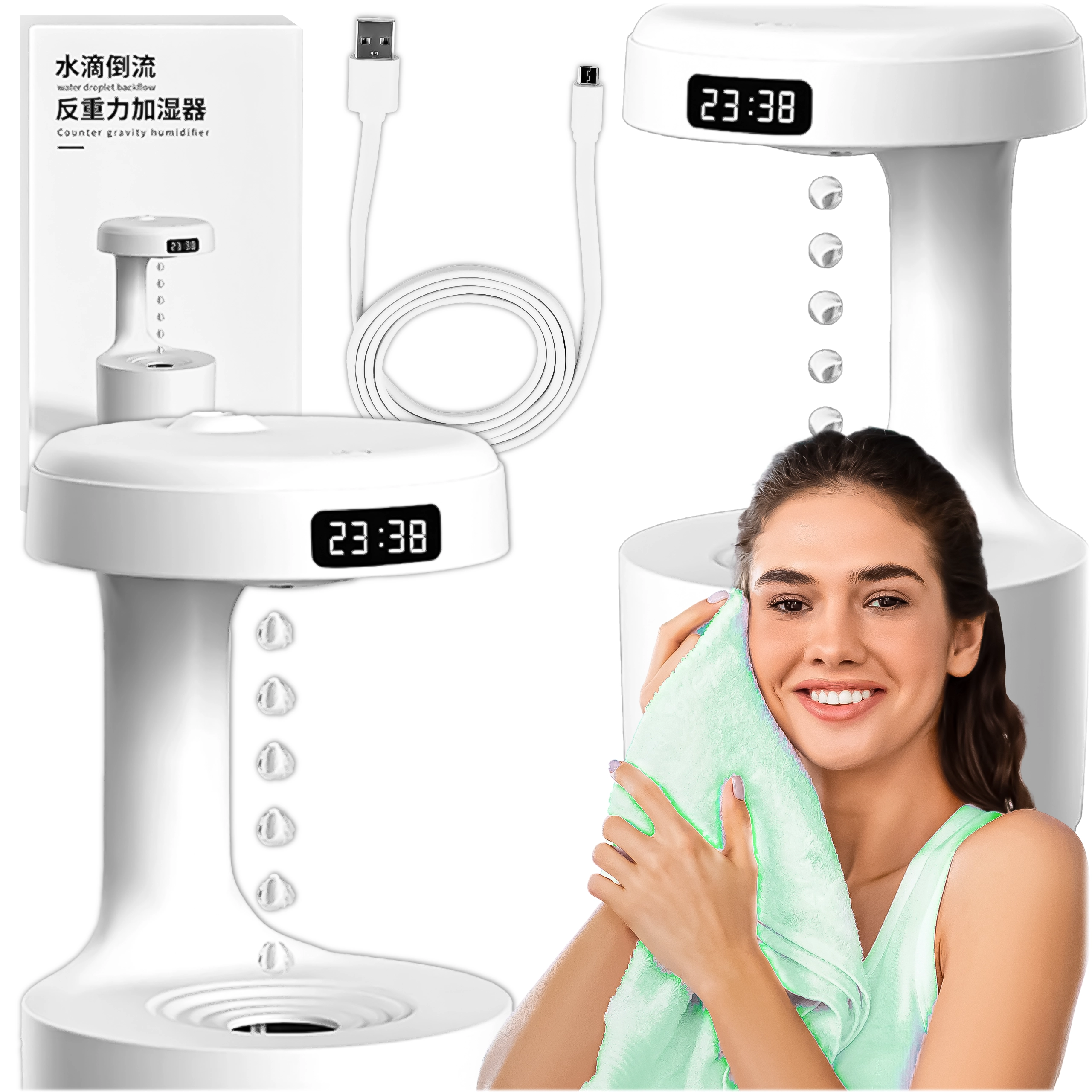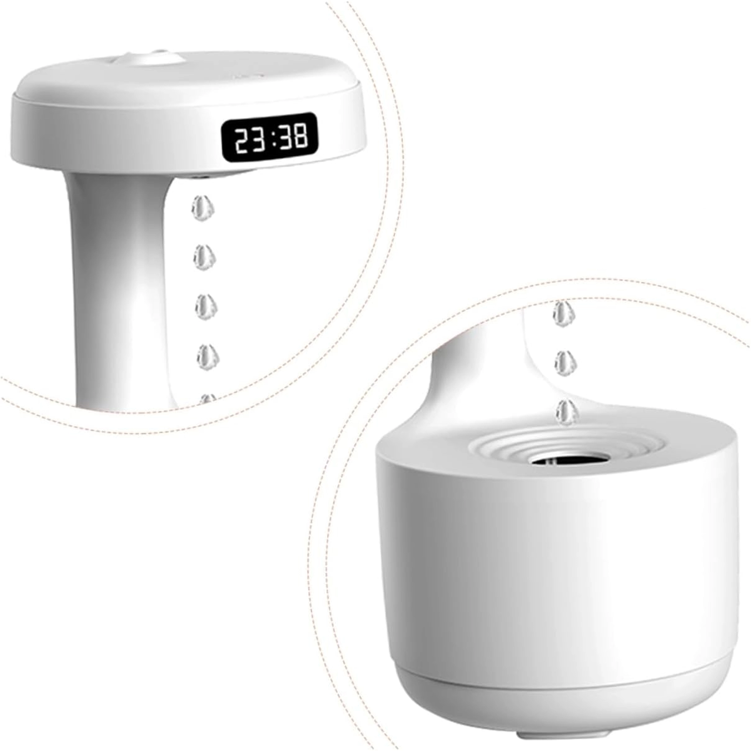 Antigravitačný zvlhčovač vzduchu prináša pôsobivý vizuálny efekt „stúpajúcich kvapiek“ a zároveň účinne zvyšuje vlhkosť v interiéri. Vďaka pokročilej technológii vytvára jemnú hmlu, ktorá pomáha zmierniť suchý vzduch, podráždenie slizníc a uľahčuje dýchanie počas dňa aj v noci. Integrovaný LED displej zobrazuje čas a stav, zatiaľ čo tichý chod neruší spánok.