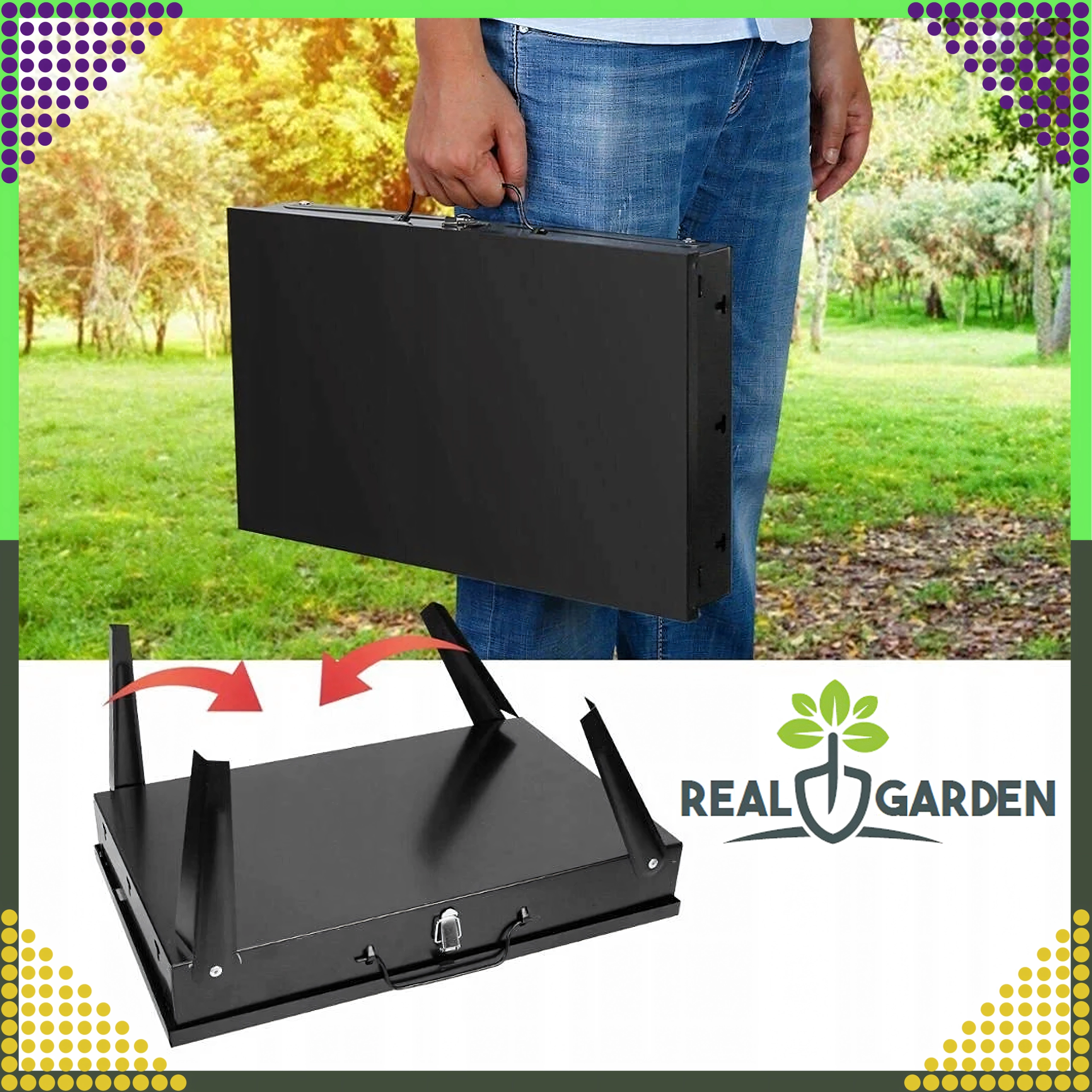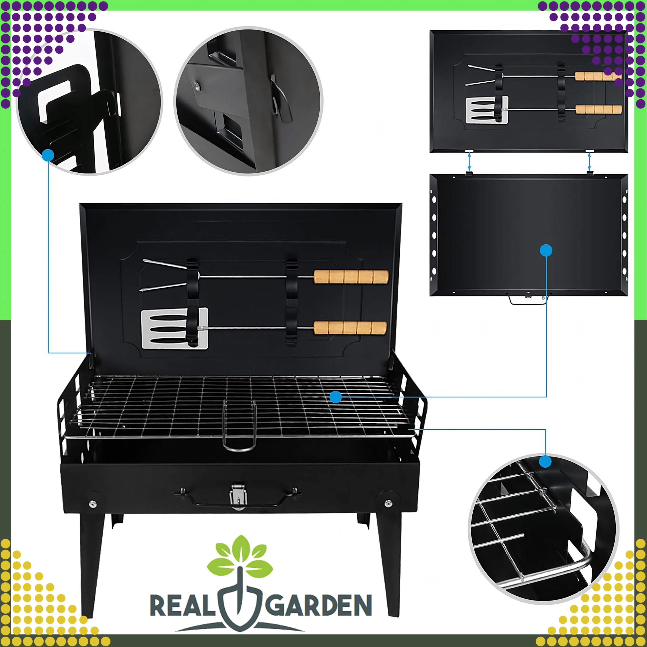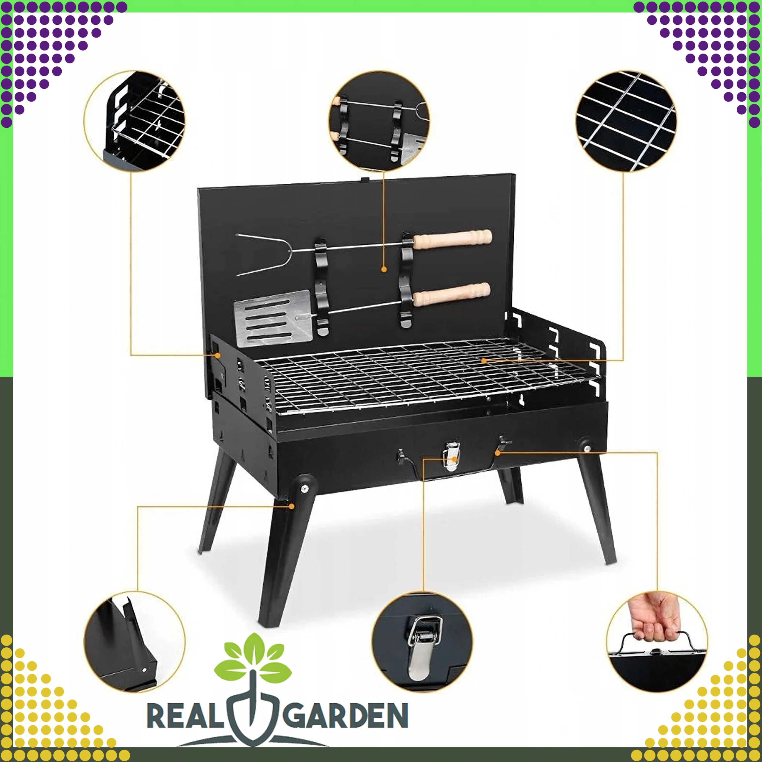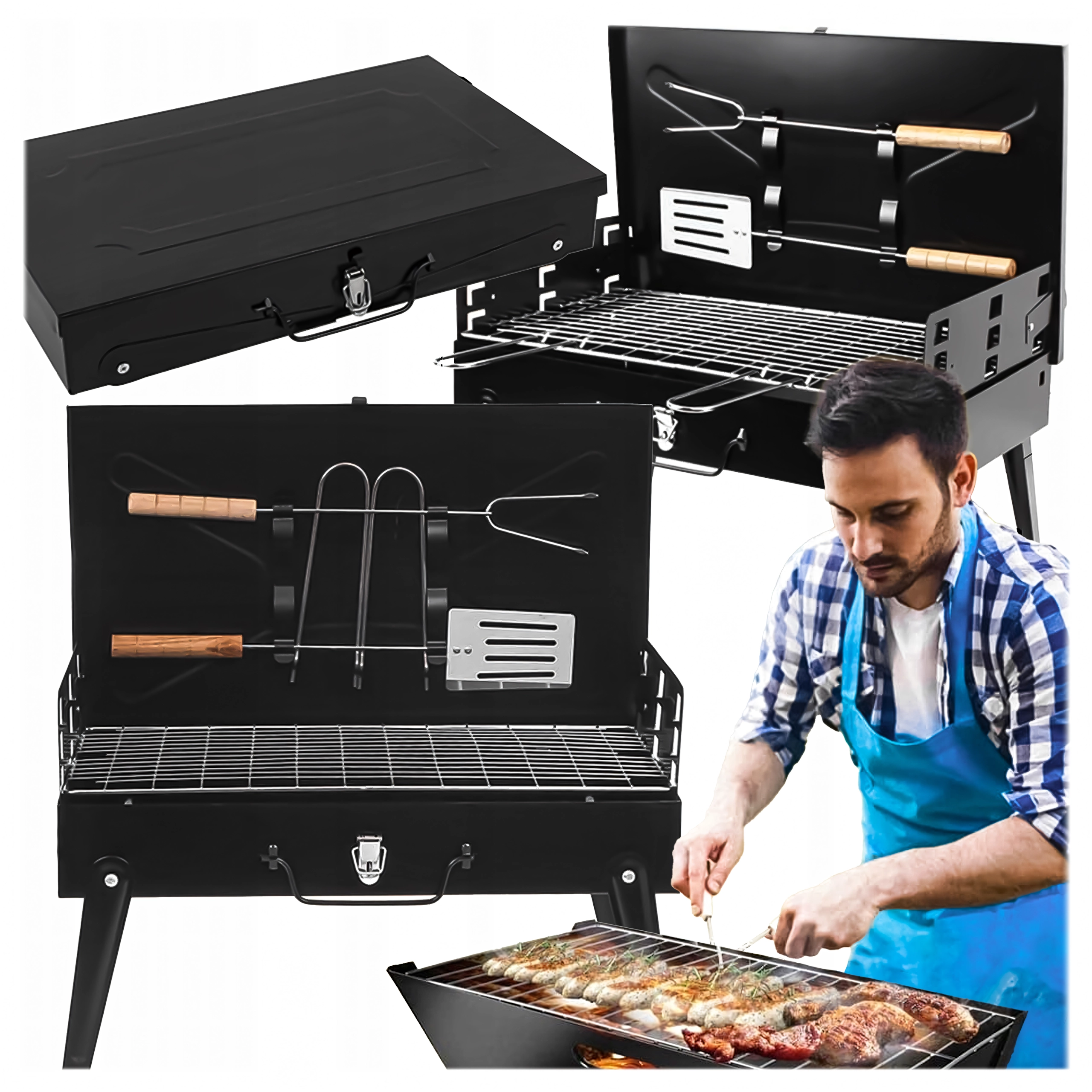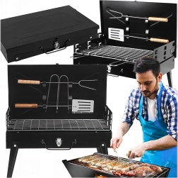 Užite si grilovanie kdekoľvek s týmto skladacím a prenosným uhlíkovým grilom v praktickom kufríkovom dizajne. Rýchla montáž bez náradia, stabilná konštrukcia a kompaktné rozmery 44 × 27 × 47 cm z neho robia ideálnu voľbu na kempovanie, záhradu aj piknik. Súčasťou je rošt aj základné grilovacie náradie (lopatka, kliešte, špíz). Vetracie otvory zabezpečujú efektívnejšie horenie a rýchlejšiu prípravu jedál.