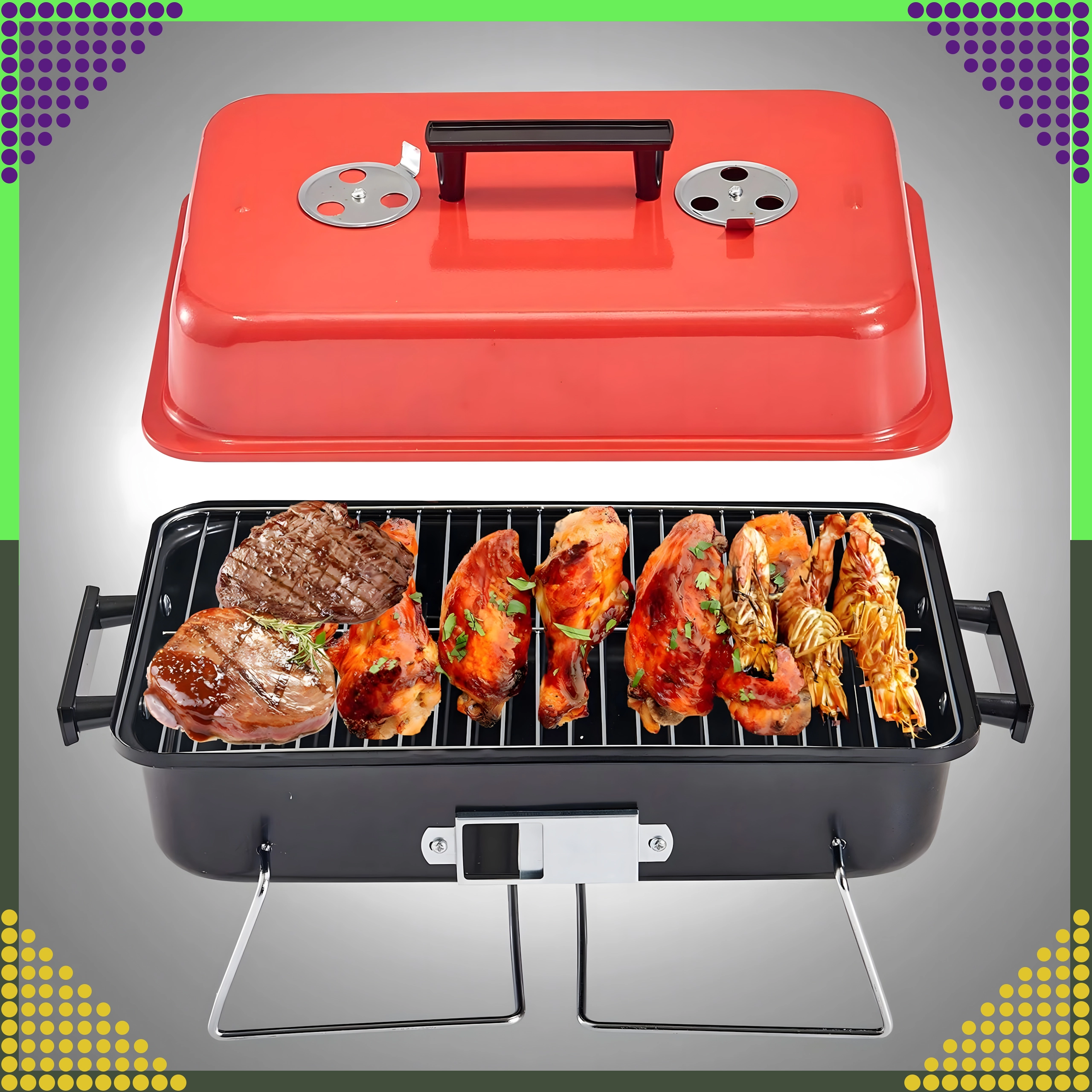 Užite si grilovanie kdekoľvek – na výletoch, pri jazere alebo na záhrade. Tento prenosný stolový gril s vekom kombinuje pevnú konštrukciu a ľahký dizajn, takže ho bez námahy prenesiete a rýchlo pripravíte na použitie. Veko s nastaviteľnými prieduchmi pomáha udržať a zvyšovať teplotu pre šťavnaté steaky, zeleninu aj ryby.
