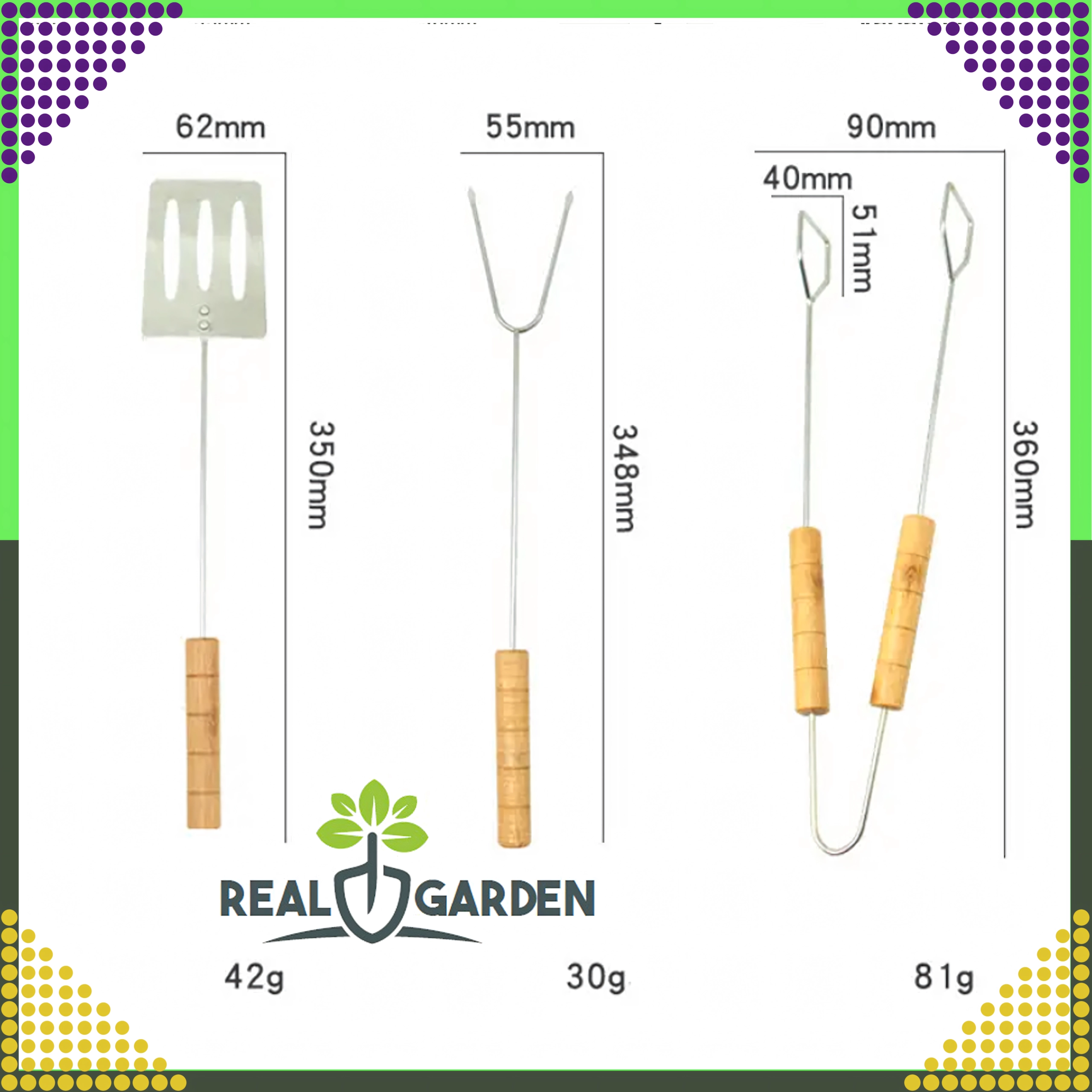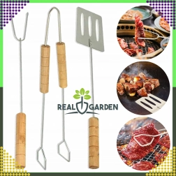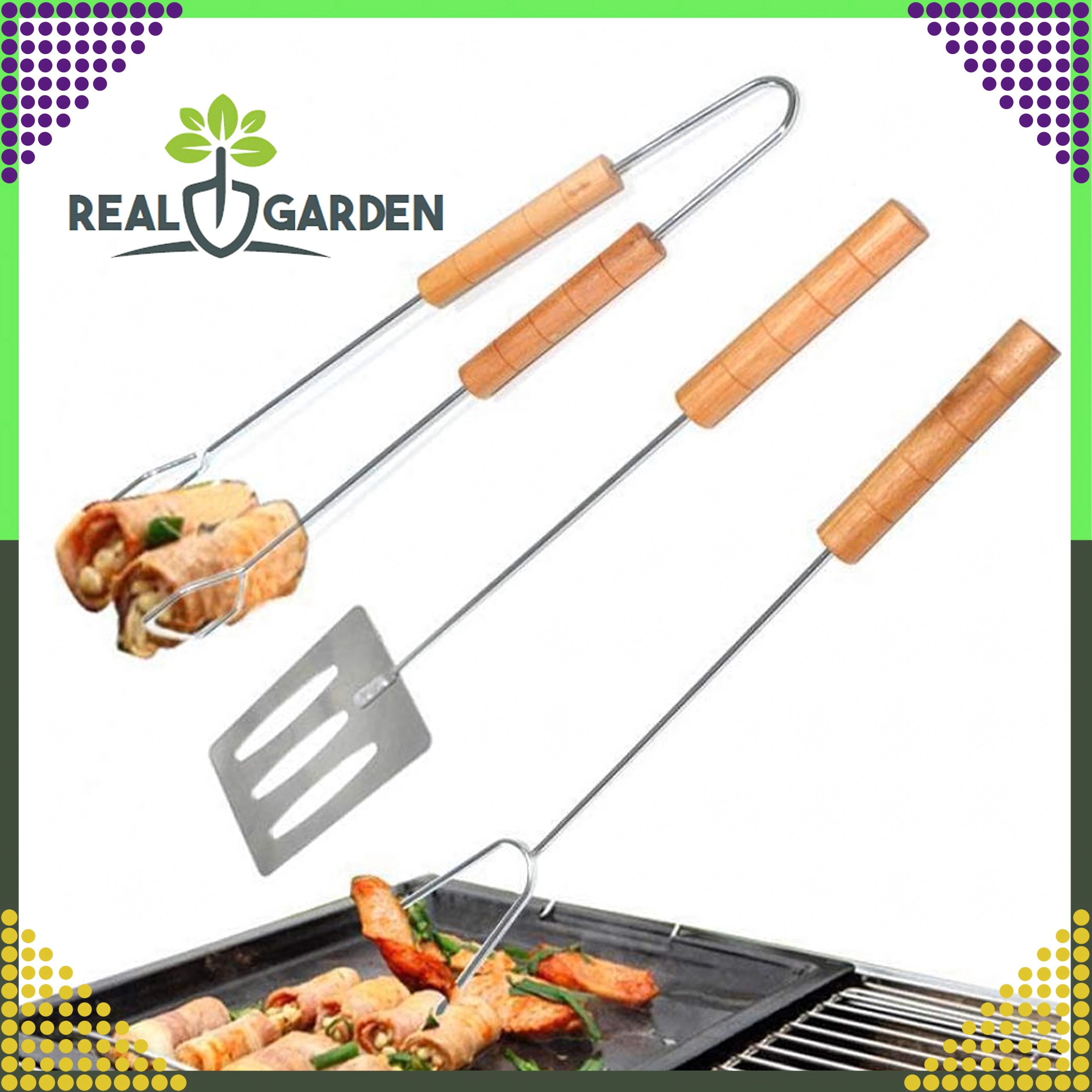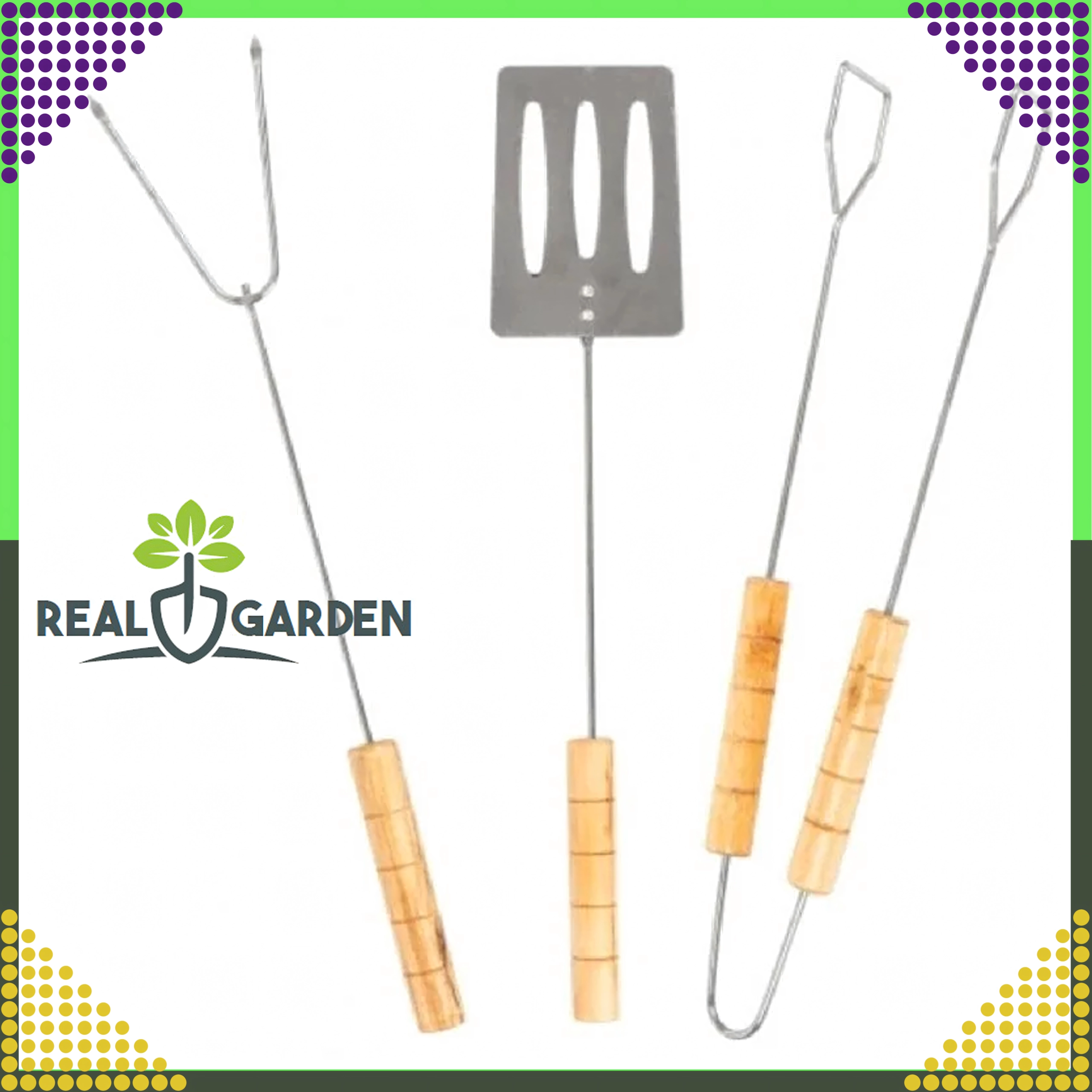 Praktická súprava grilovacieho náradia 3v1 urobí z každého grilovania radosť. Obsahuje kliešte, obracačku a vidlicu z nehrdzavejúcej ocele s pohodlnými drevenými rukoväťami pre pevný úchop a bezpečné ovládanie pri príprave mäsa aj zeleniny.