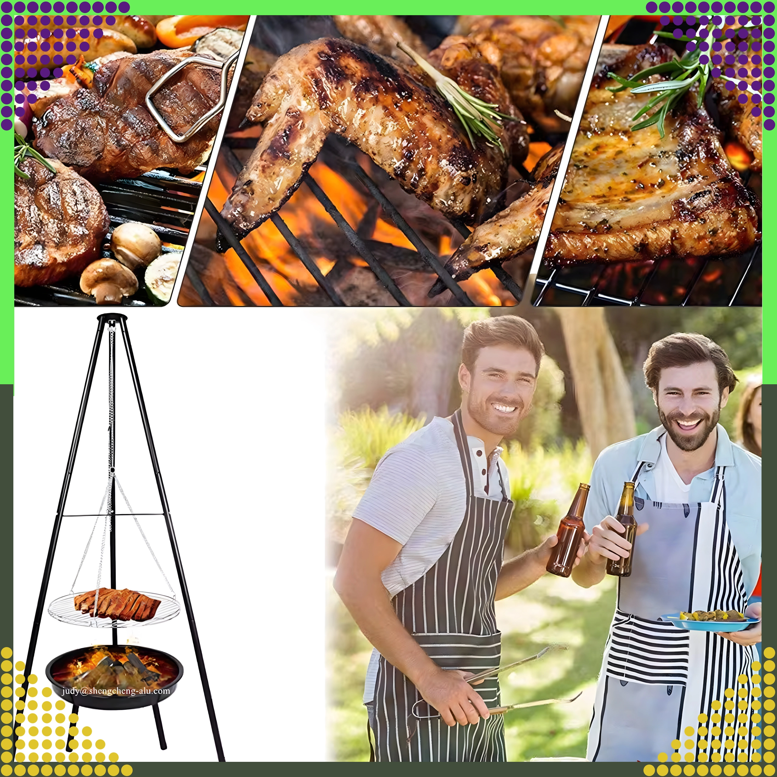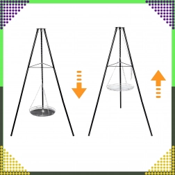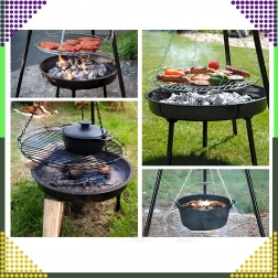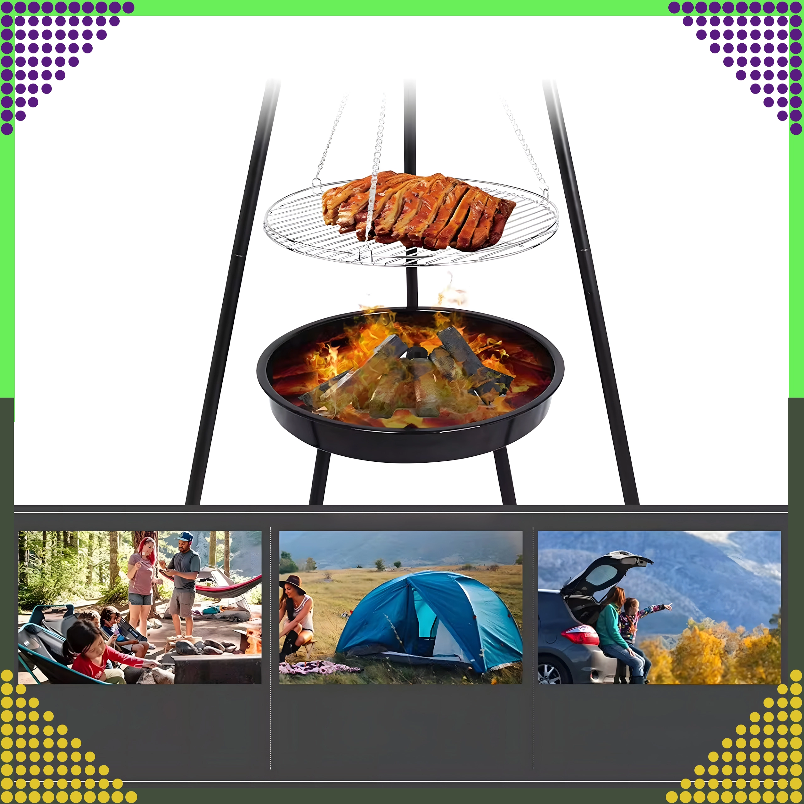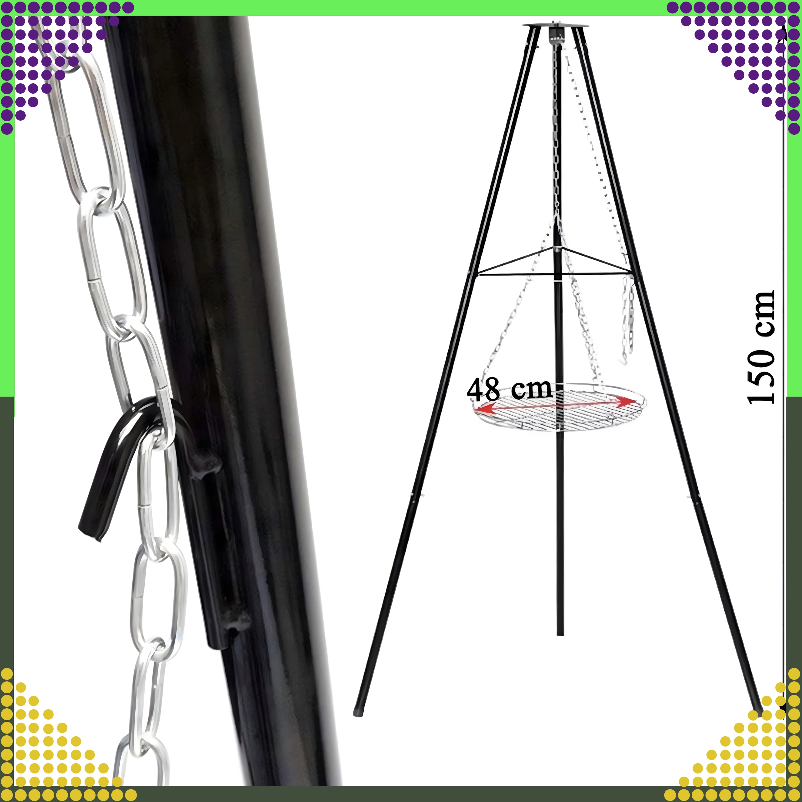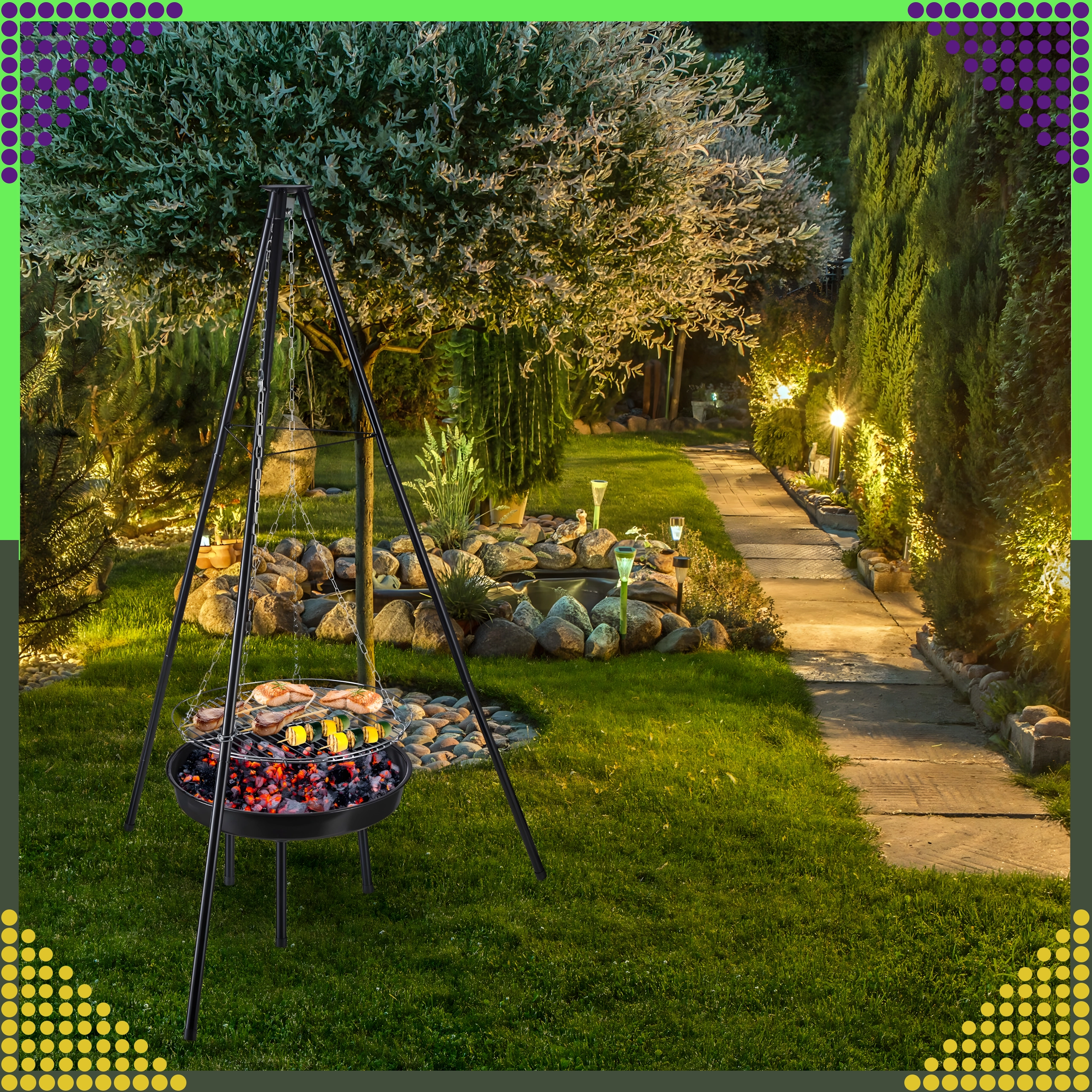 Tento elegantný a odolný záhradný trojnožkový gril je skvelým riešením pre všetkých, ktorí chcú grilovať nad otvoreným ohňom, ale nemajú stále miesto pre ohnisko. Výškovo nastaviteľný rošt (Ø 50 cm) so zavesením na reťaziach umožňuje presnú kontrolu teploty a rovnomerné prepečenie mäsa aj zeleniny. Stabilná trojnohá konštrukcia z práškovo lakovanej ocele je odolná voči vysokým teplotám a ľahko sa udržiava.