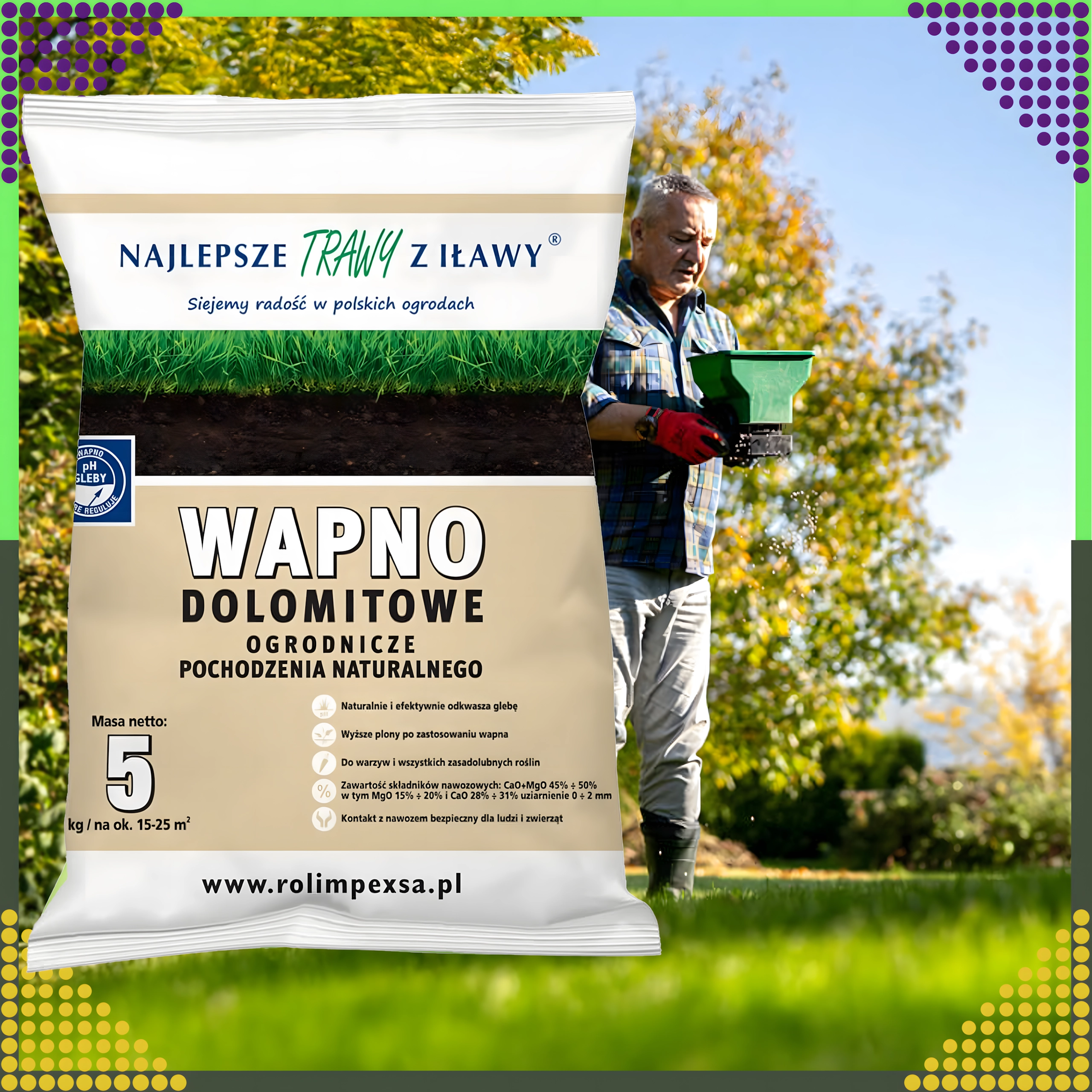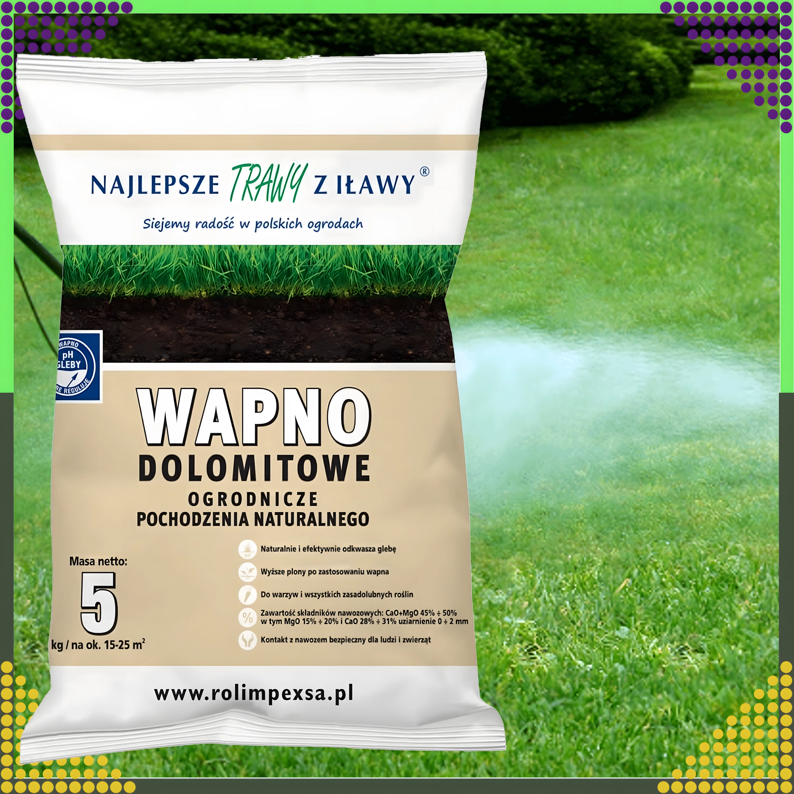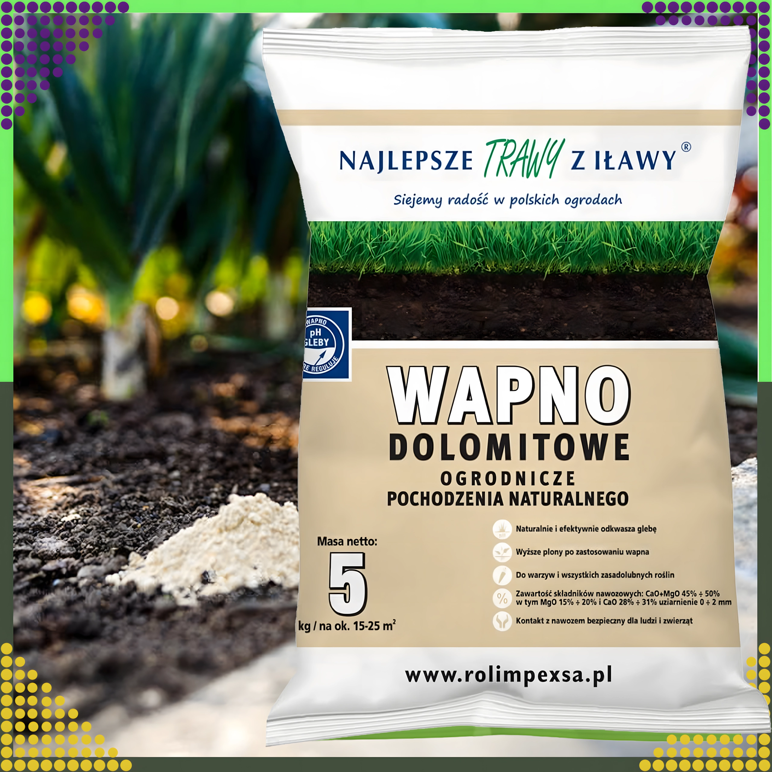 Tip na použitie: Aplikujte rovnomerne na suchú pôdu a ľahko zapracujte do povrchu. Najvhodnejší termín je jeseň alebo predsezónna jar. Dávkovanie prispôsobte aktuálnej kyslosti pôdy a potrebám rastlín.