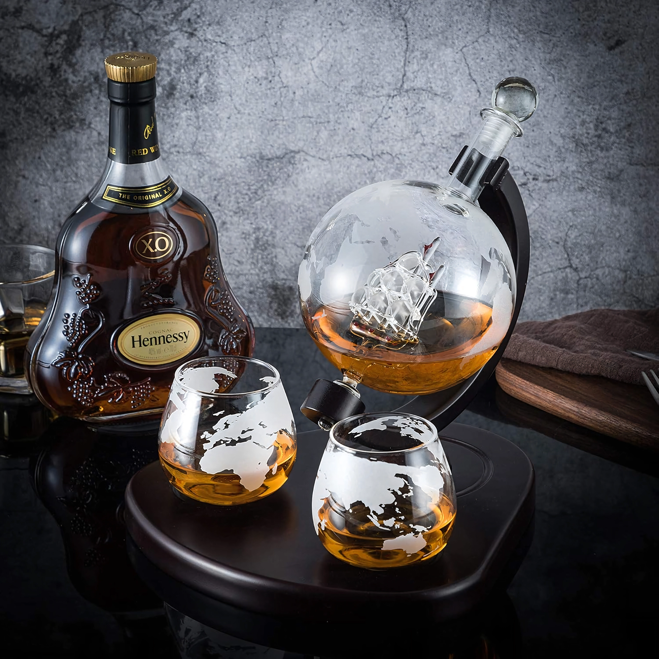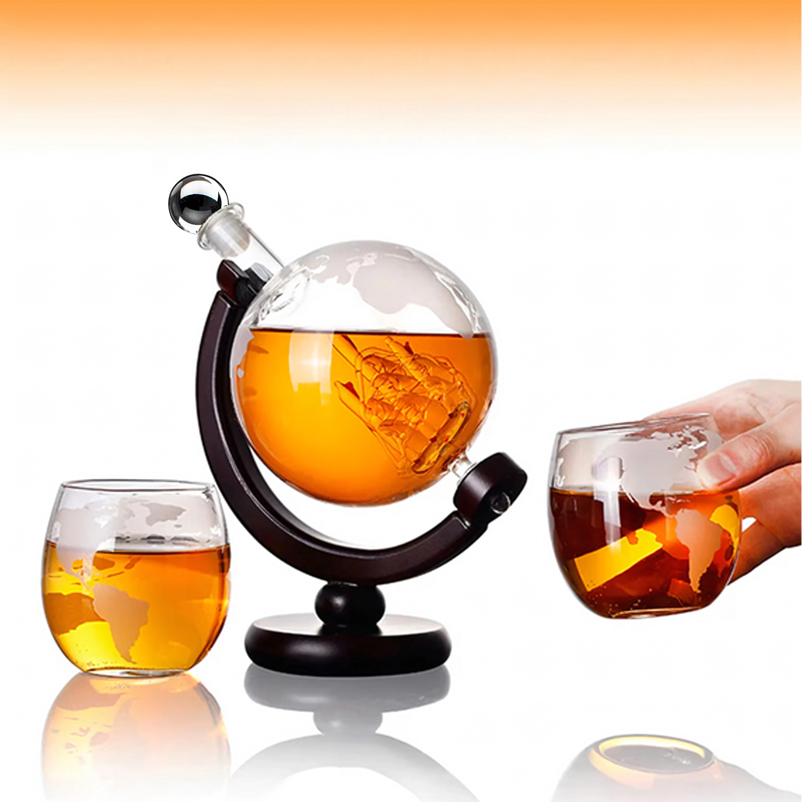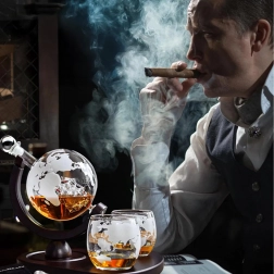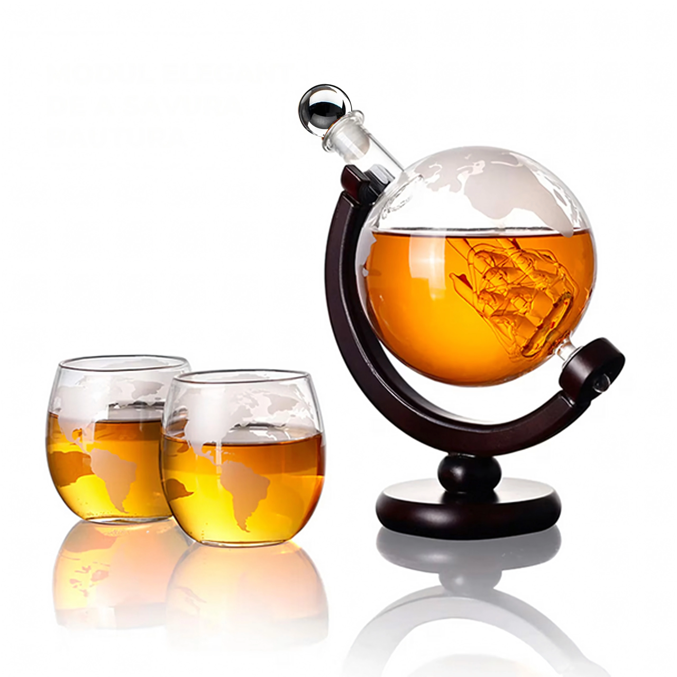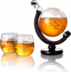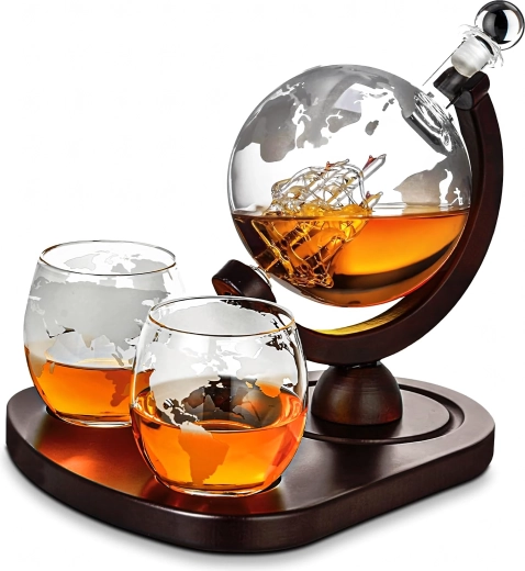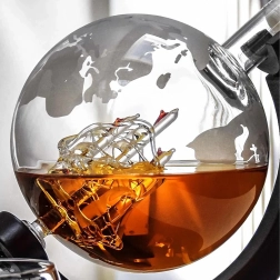 Objavte jedinečné spojenie dizajnu a funkčnosti. Karafa s objemom 850 ml je uložená na tmavom drevenom stojane, ktorý umožňuje pohodlné nakláňanie a servírovanie. Vo vnútri karafy sa nachádza dekoratívna sklenená loď a steny zdobí jemné rytie mapy sveta, ktoré dodáva setu luxusný charakter.