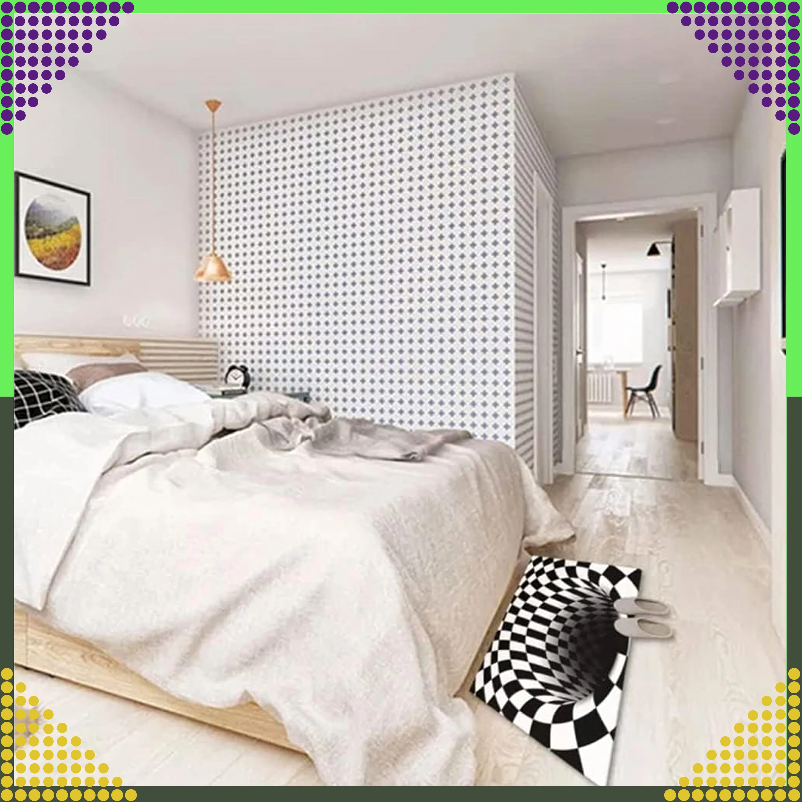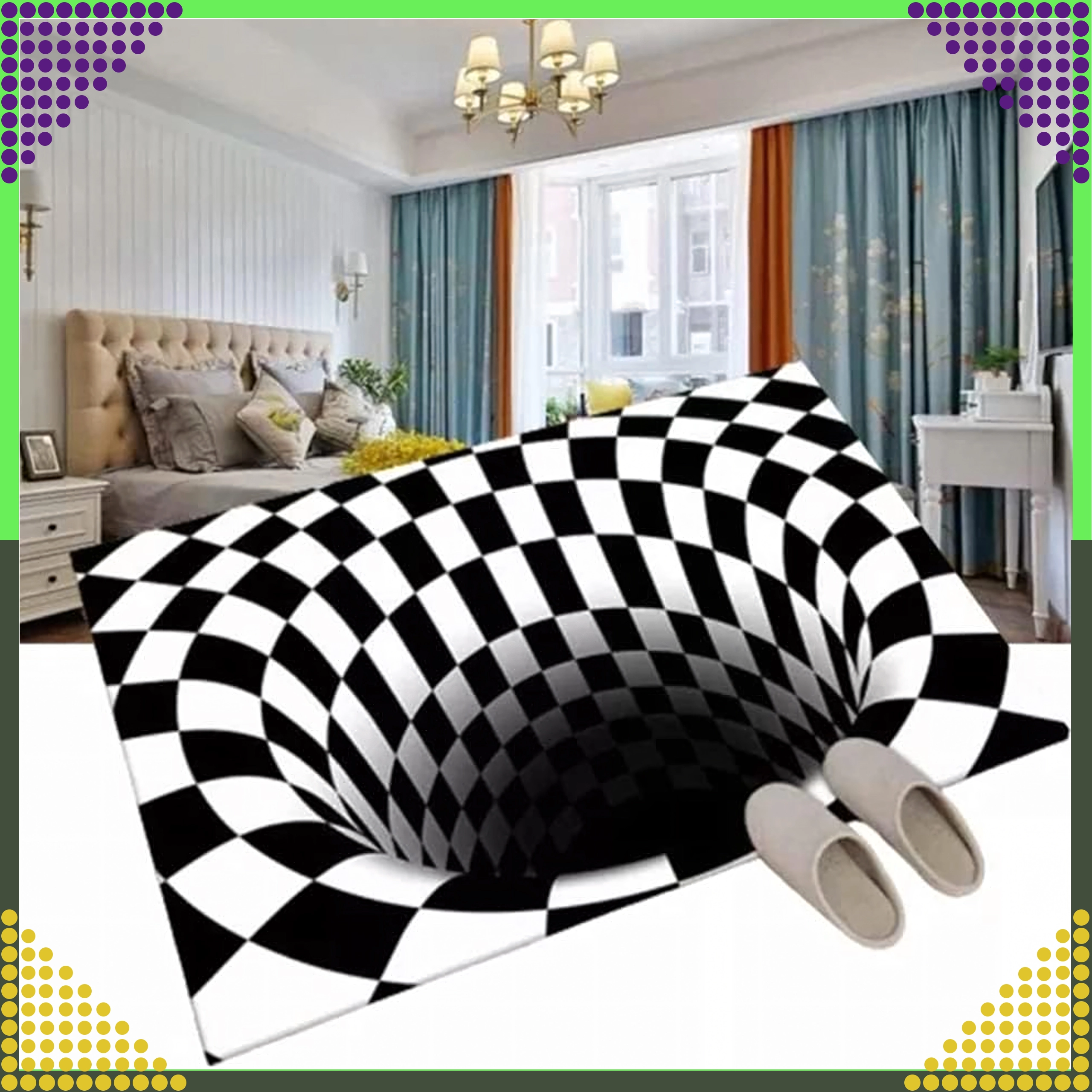 Čierno‑biely šachovnicový vortex vytvára výraznú optickú ilúziu hĺbky. Štýlový prvok, ktorý pozdvihne každý interiér aj vstupný priestor.