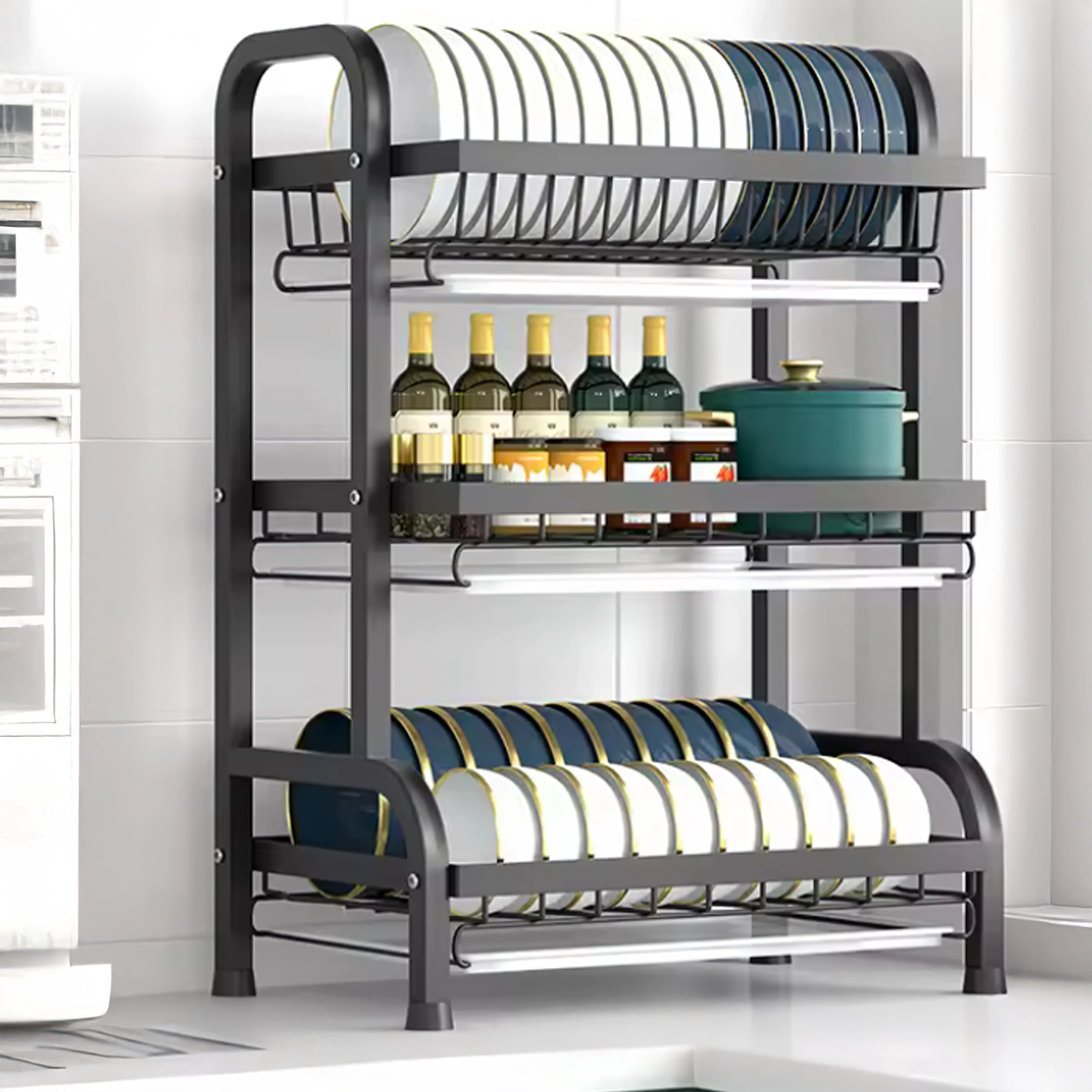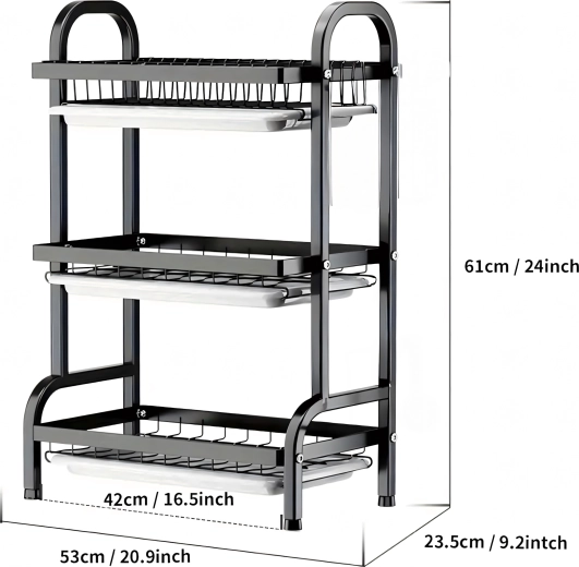 Tento veľkokapacitný, trojúrovňový odkvapkávač na riad XXL kombinuje pevnú kovovú konštrukciu s čistým, moderným vzhľadom. Vďaka nerezovej oceli odolnej proti hrdzi a ľahko vyberateľným odkvapkávacím táckom udržiava kuchynskú linku suchú a zorganizovanú.