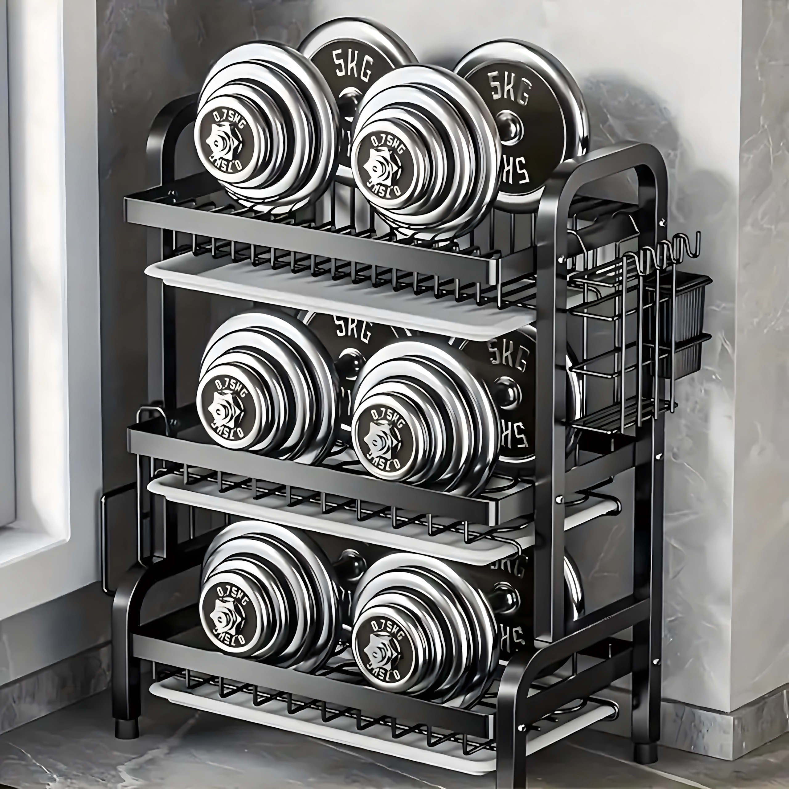Chytré vertikálne usporiadanie pojme taniere, misky aj poháre, šetrí pracovnú plochu a urýchľuje sušenie.