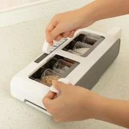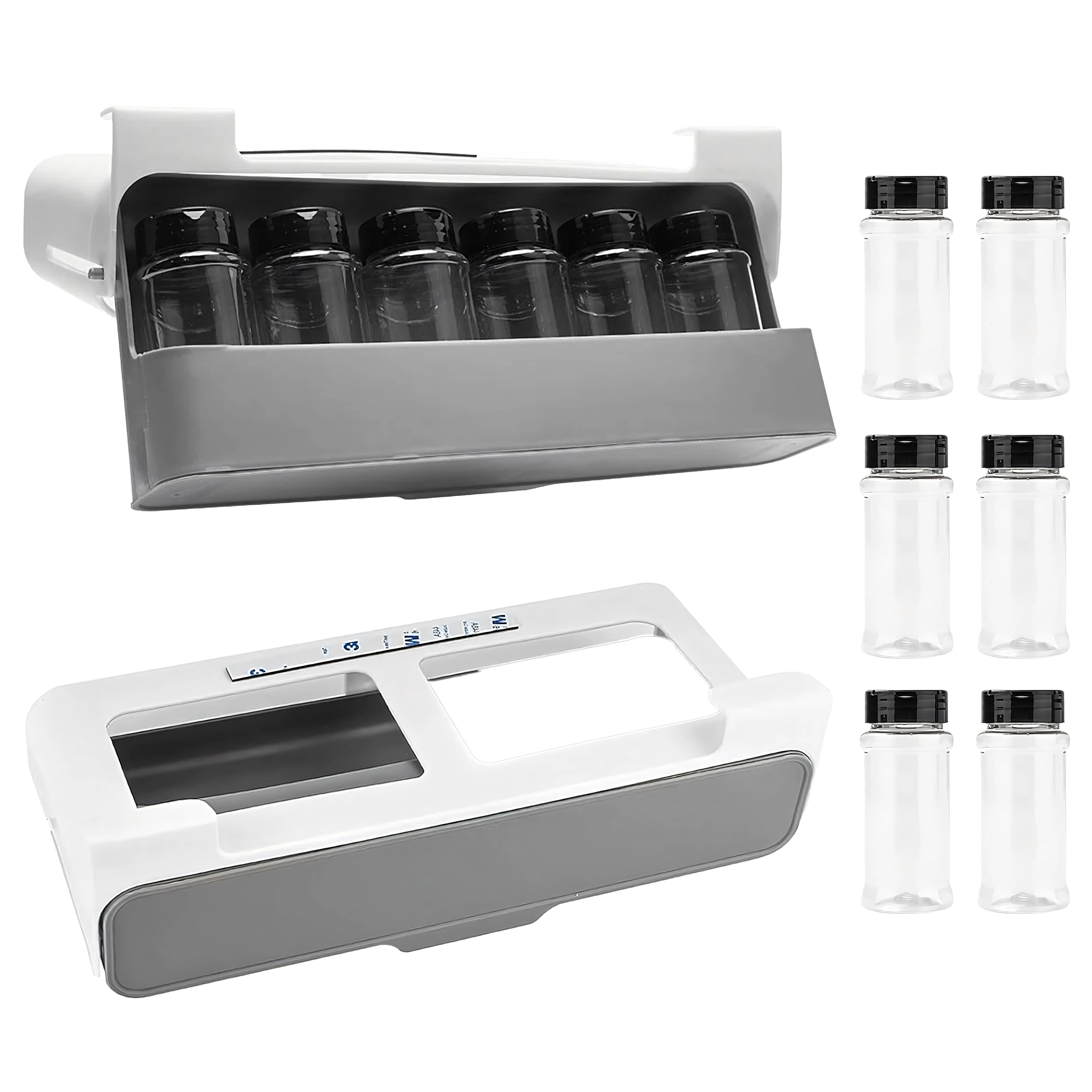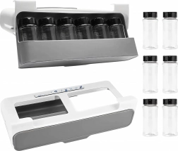 Šesť priehľadných sklenených dóz s čiernymi viečkami udrží koreniny čerstvé a čisté. Minimalistické prevedenie v bielo‑sivej farbe sa hodí do moderných aj klasických kuchýň a efektívne využíva priestor pod policou alebo v skrinke.