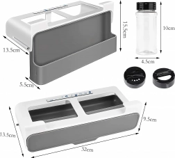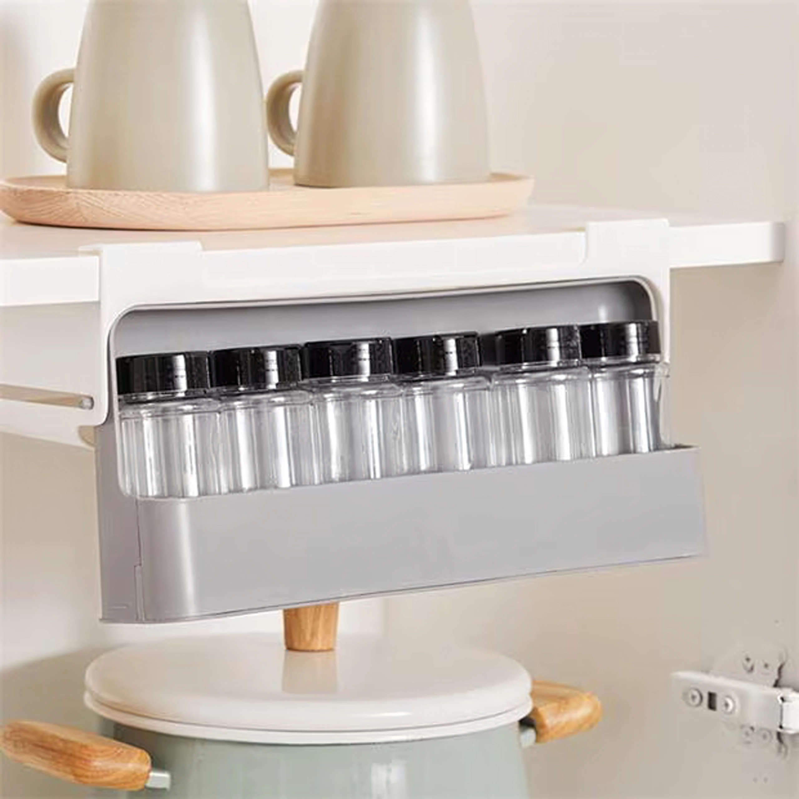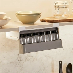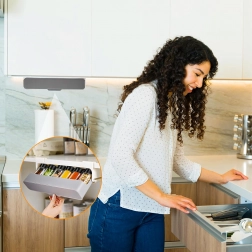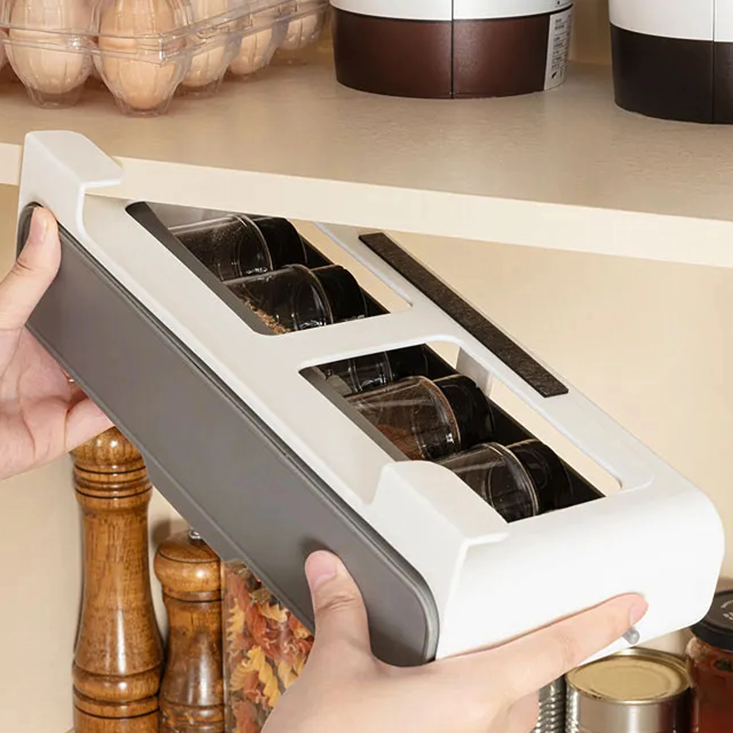 Praktický podvesný organizér na koreniny vám umožní mať obľúbené koreniny vždy po ruke a zároveň uvoľniť pracovnú plochu. Vďaka prehľadnej zásuvnej konštrukcii ľahko vysuniete lištu s pohárikmi a hneď vidíte, čo potrebujete. Samolepiaca montáž s páskou 3M zaistí pevné uchytenie bez vŕtania a poškodenia nábytku.