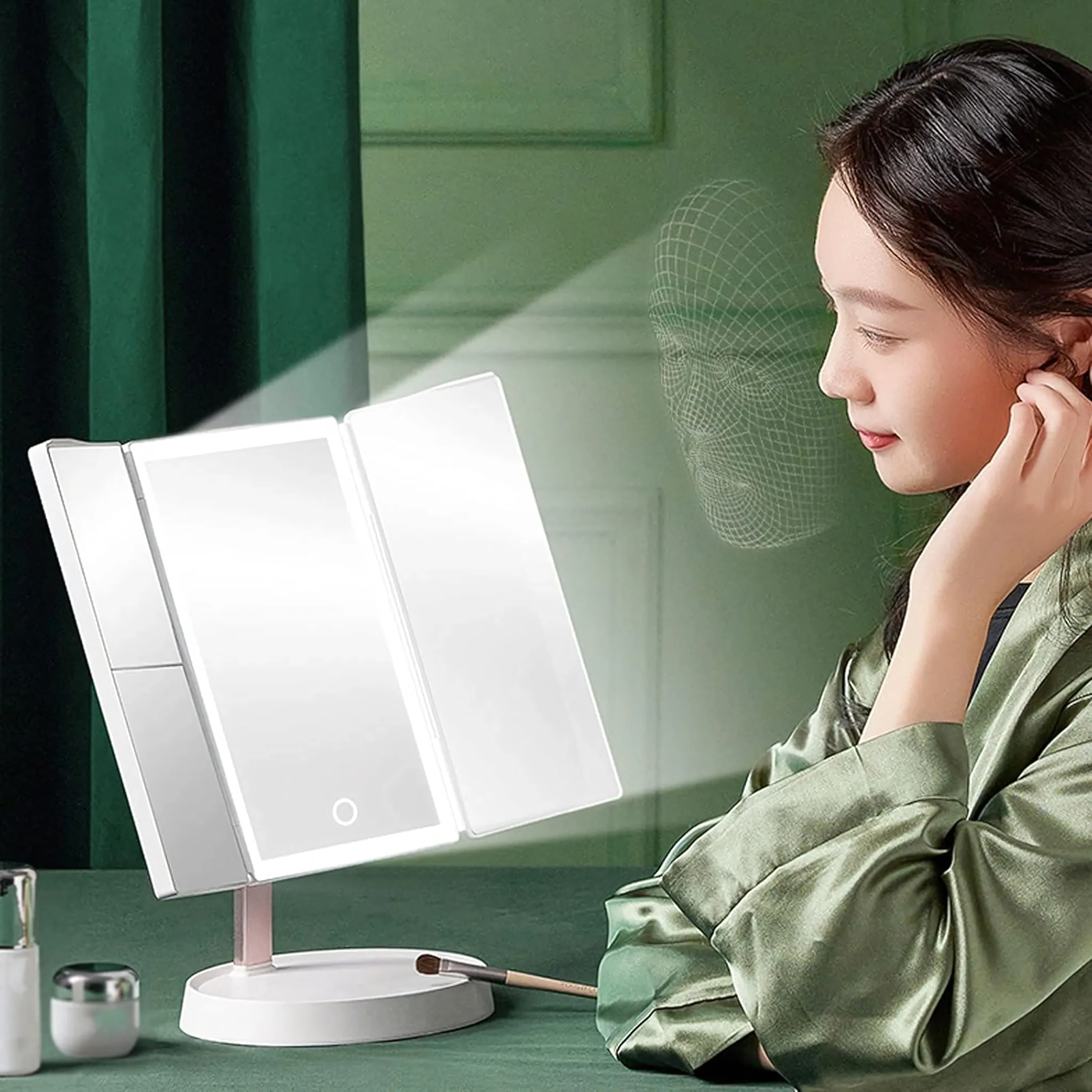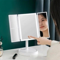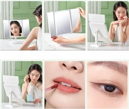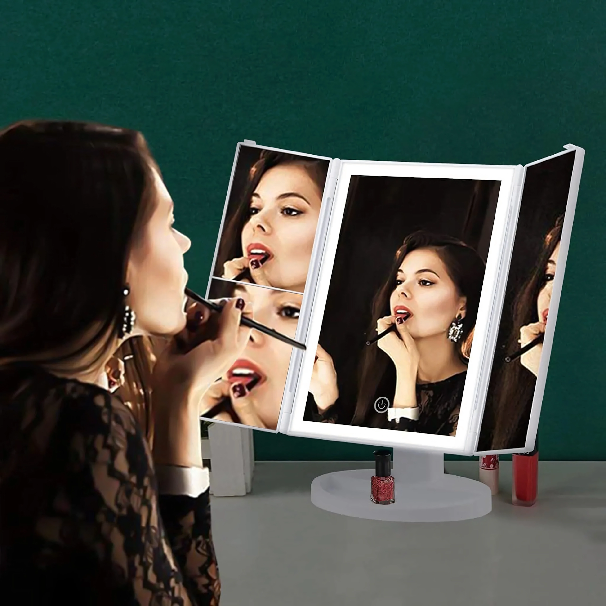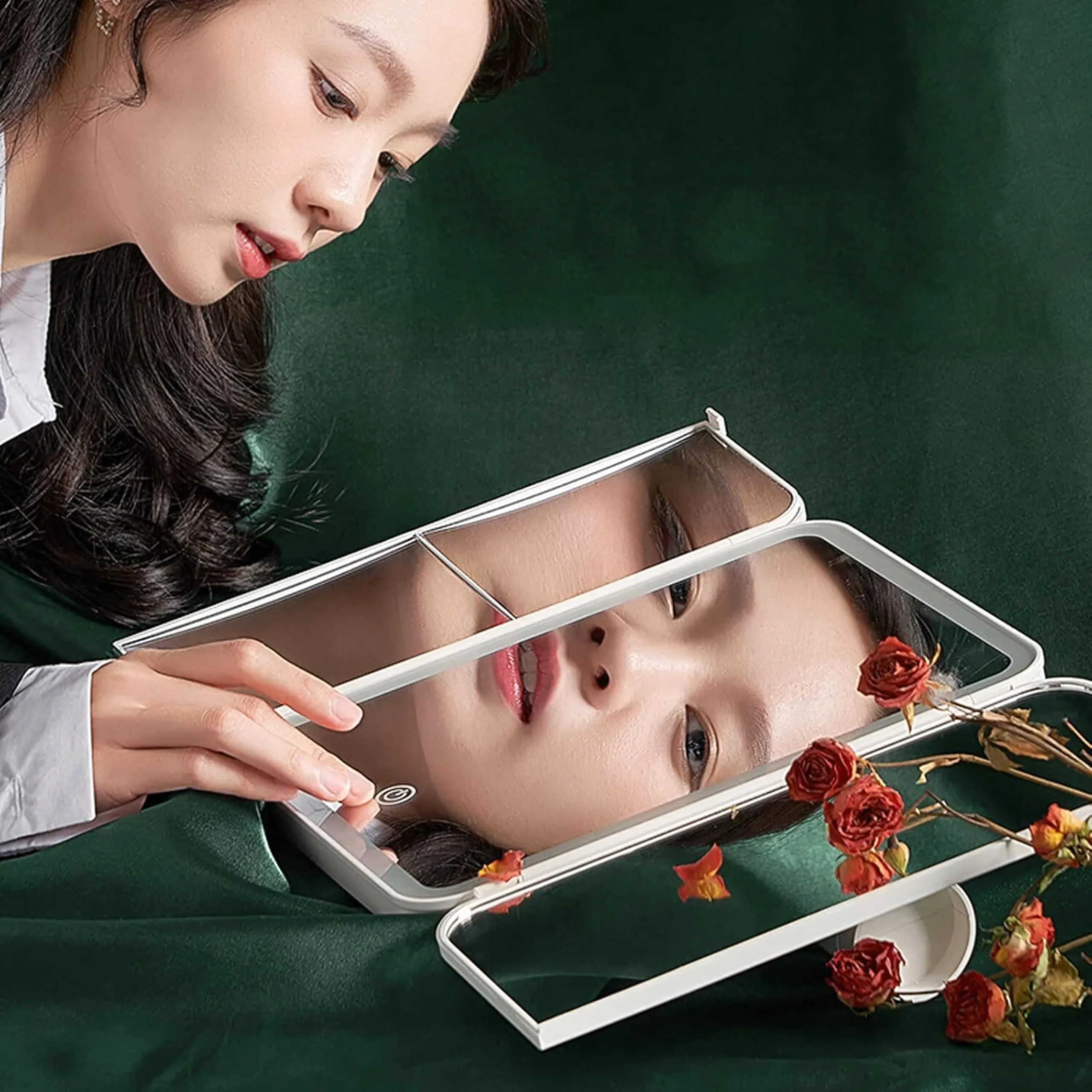 Objavte praktické a štýlové zrkadlo, ktoré vám pomôže vytvoriť bezchybný make-up kedykoľvek počas dňa. Stredový panel s dotykovým ovládaním a integrovaným LED podsvietením poskytuje jasné, rovnomerné svetlo, zatiaľ čo bočné krídla rozšíria zorné pole a uľahčia detailné úpravy.