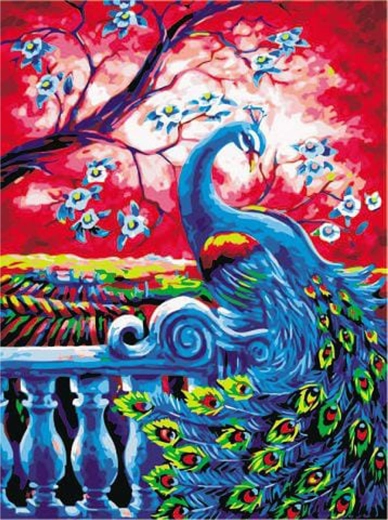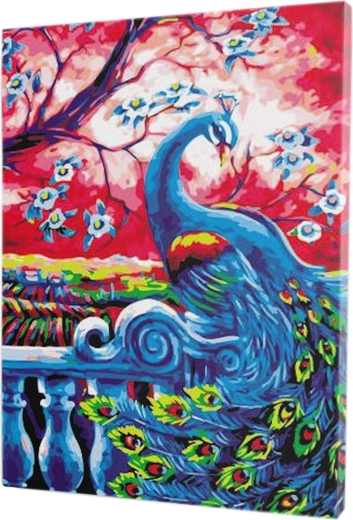 Kompletný set s plátnom na ráme, farbami a štetcami. Po dokončení môžete obraz s motívom páva rovno zavesiť.