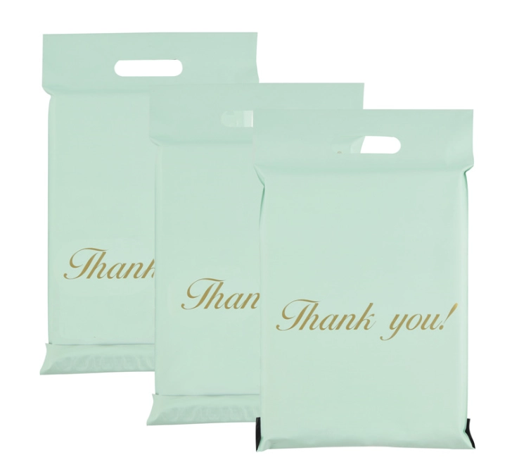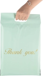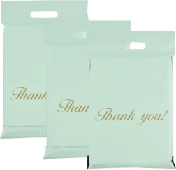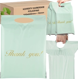 Odolné kuriérske obálky s výsekovým uchom v elegantnej mätovej farbe z pevnej LDPE fólie. Bezpečné uzatvorenie pomocou samolepiaceho pásika, ľahké prenášanie vďaka uchu a spoľahlivá ochrana zásielok pred vlhkosťou, prachom a nečistotami. Balenie obsahuje 50 kusov vo veľkosti 500 × 600 mm + 70 mm ucho s dekoratívnym nápisom „Thank you!“.