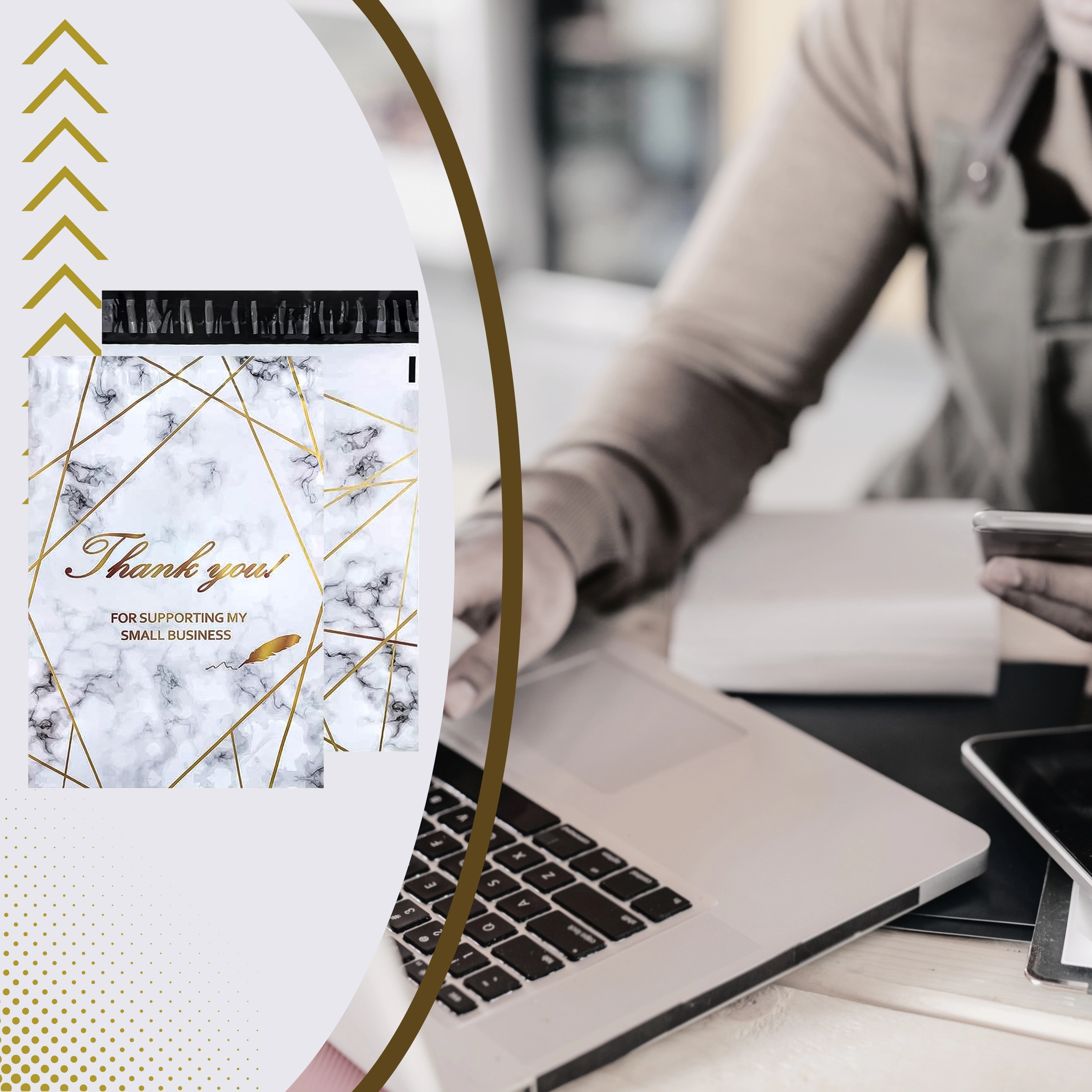 Hľadáte elegantné a spoľahlivé riešenie na balenie zásielok? Tieto kuriérne foliopaky so vzorom zlatého mramoru a výrazným poďakovaním Thank You kombinujú bezpečie, rýchlosť balenia a profesionálny vzhľad každej zásielky. Sú skvelé pre e-shopy aj podnikateľov, ktorí chcú zákazníkom doručiť tovar v perfektnom stave.