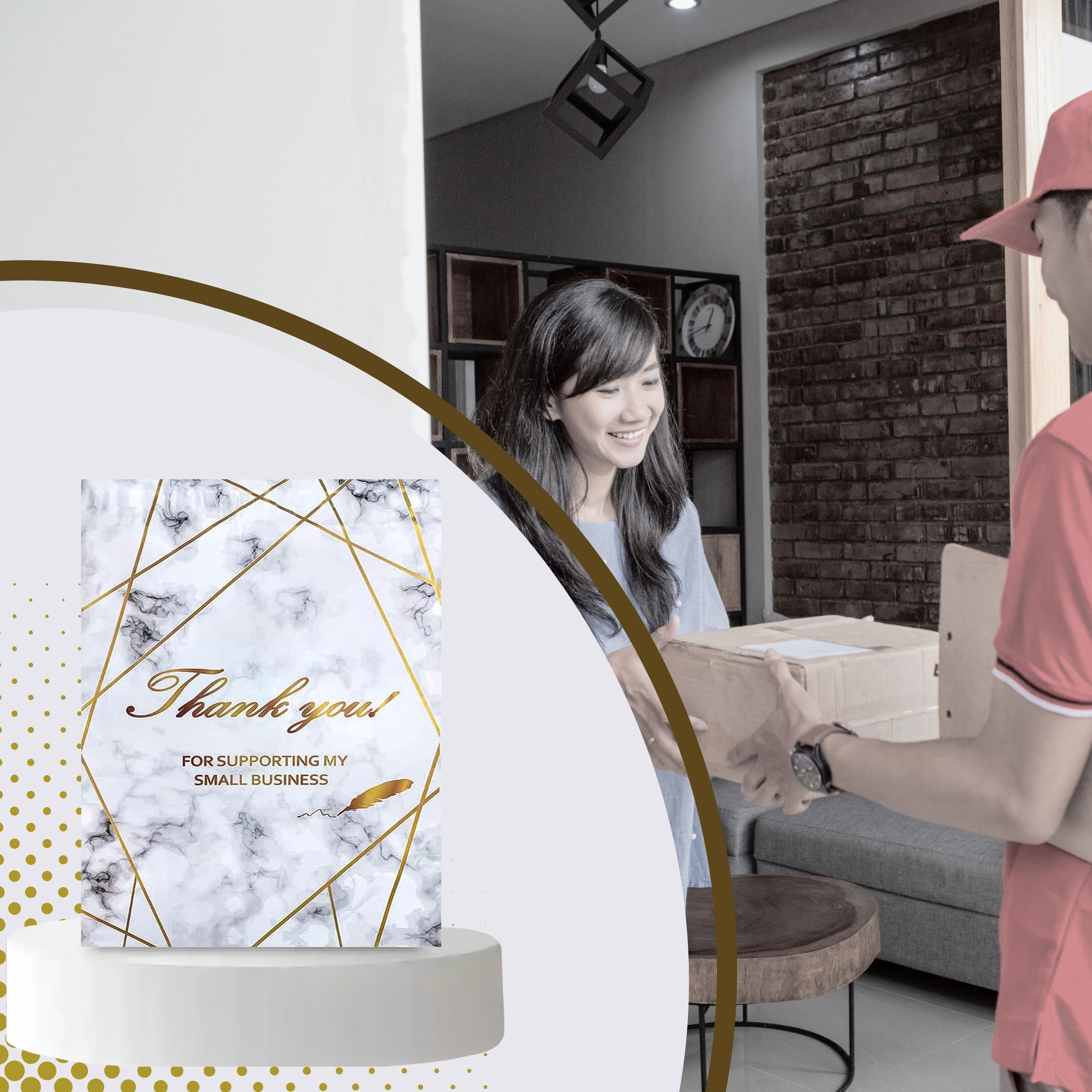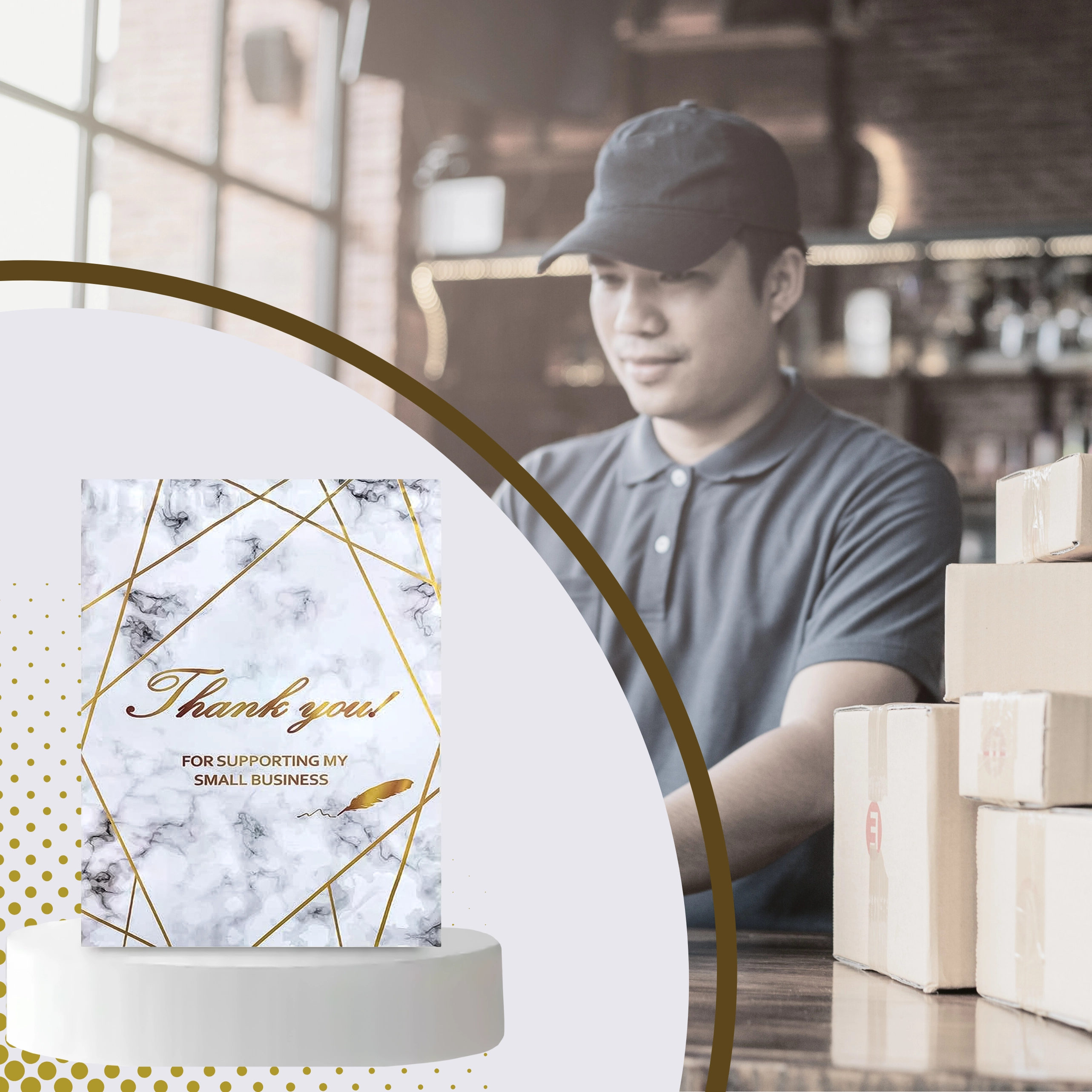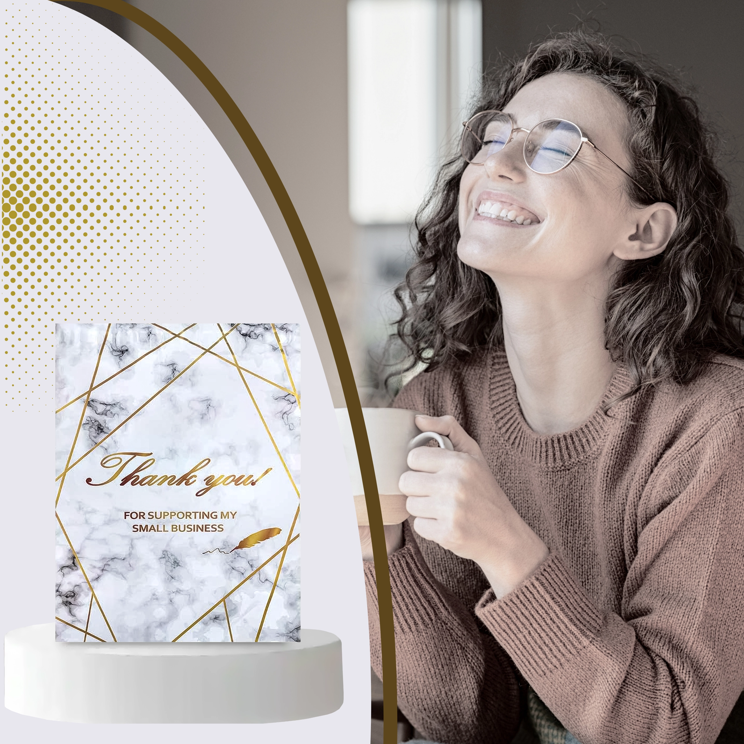 - Reprezentatívny vzhľad: zlatý mramor s potlačou Thank You pre lepší zákaznícky dojem.