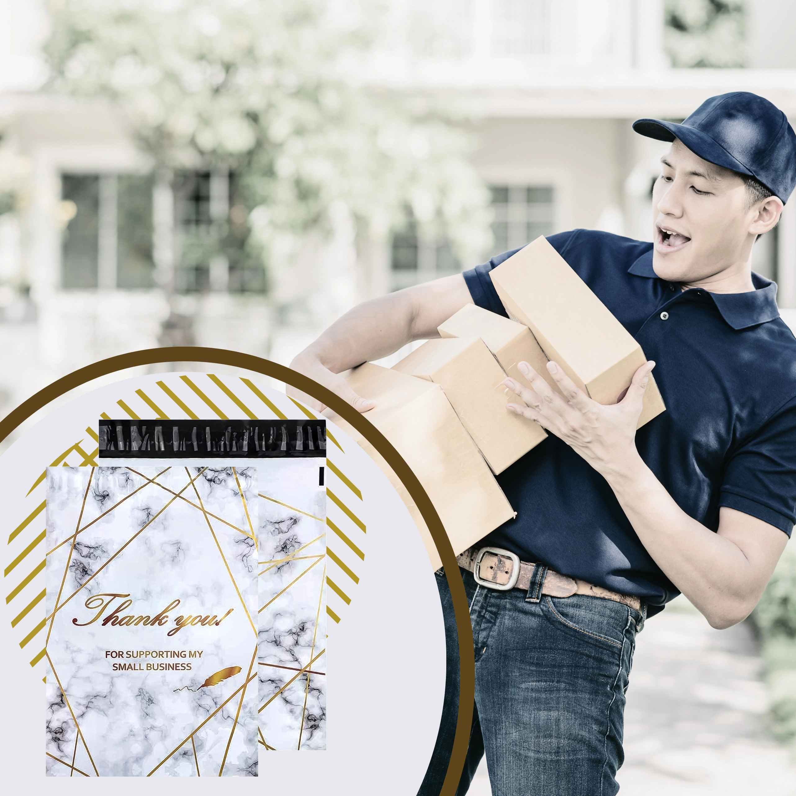 Hľadáte spoľahlivé obaly pre e‑shop alebo pravidelné zásielky? Tieto kuriérske foliopaky kombinujú pevnosť, bezpečnosť a estetiku. Rozmer 380 × 520 mm je ideálny pre menšie aj stredne veľké produkty, textil alebo príslušenstvo. Dizajn zlatý mramor s poďakovaním Thank You dodá vašim zásielkam profesionálny a prívetivý vzhľad.