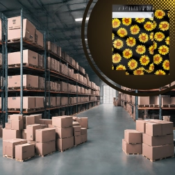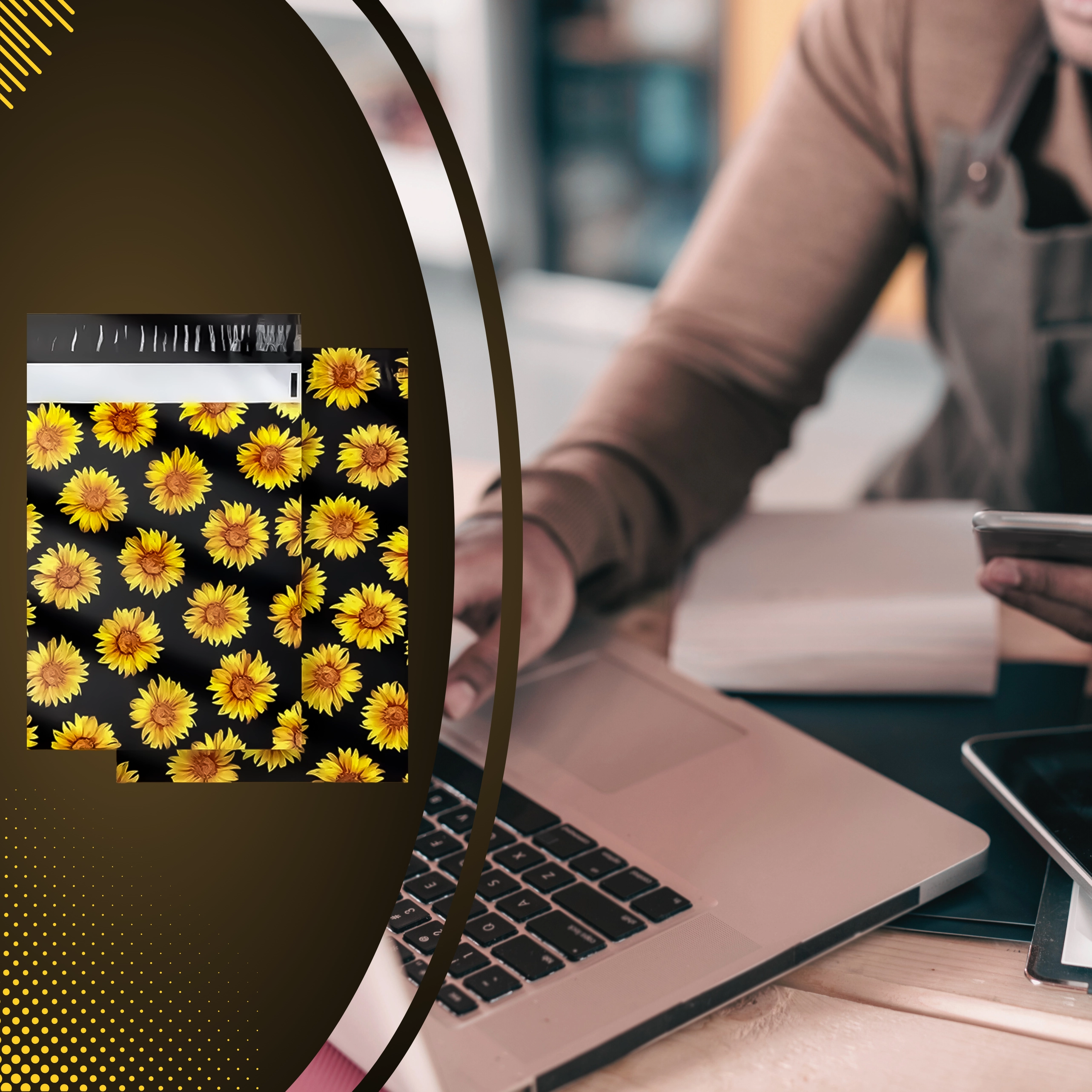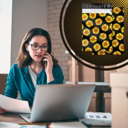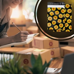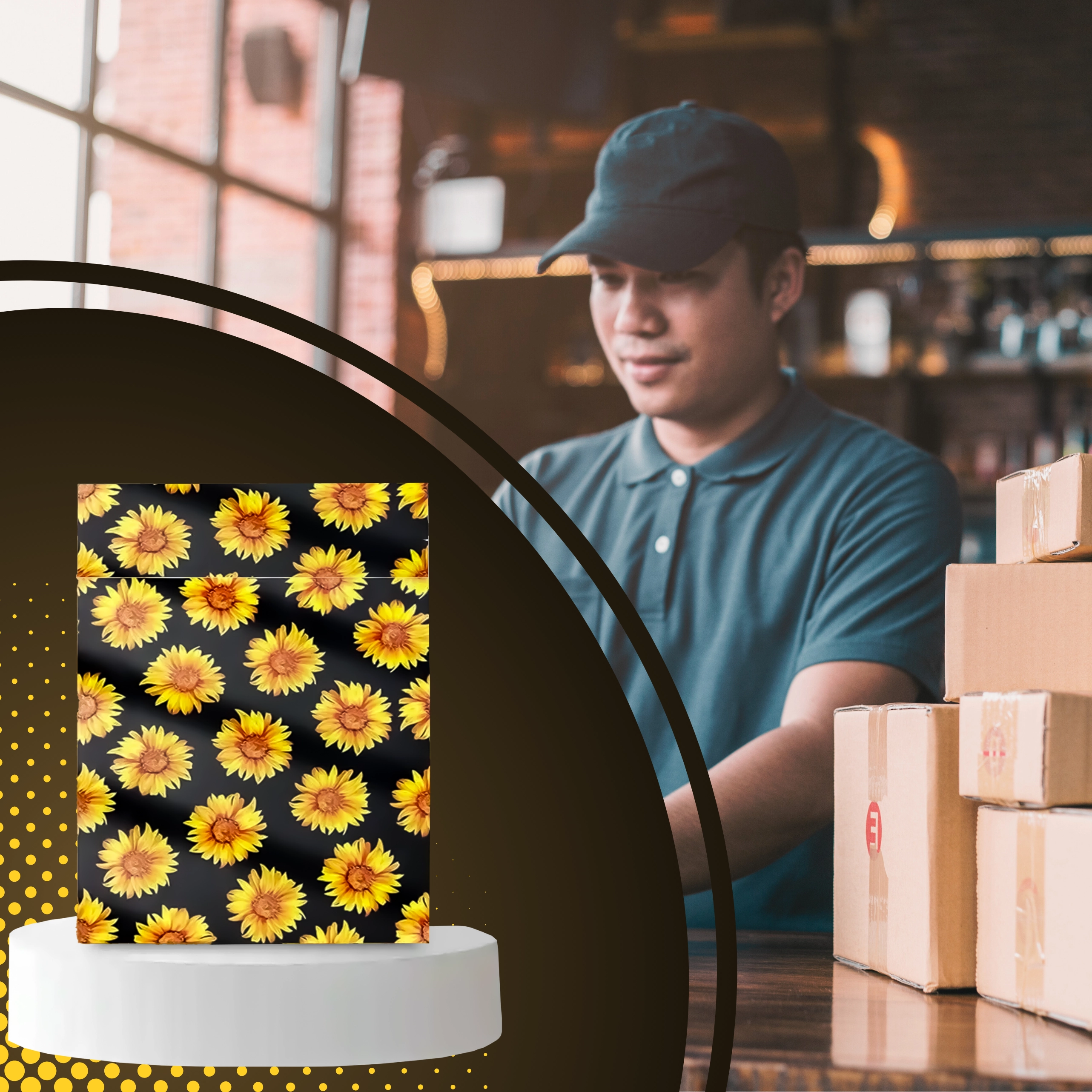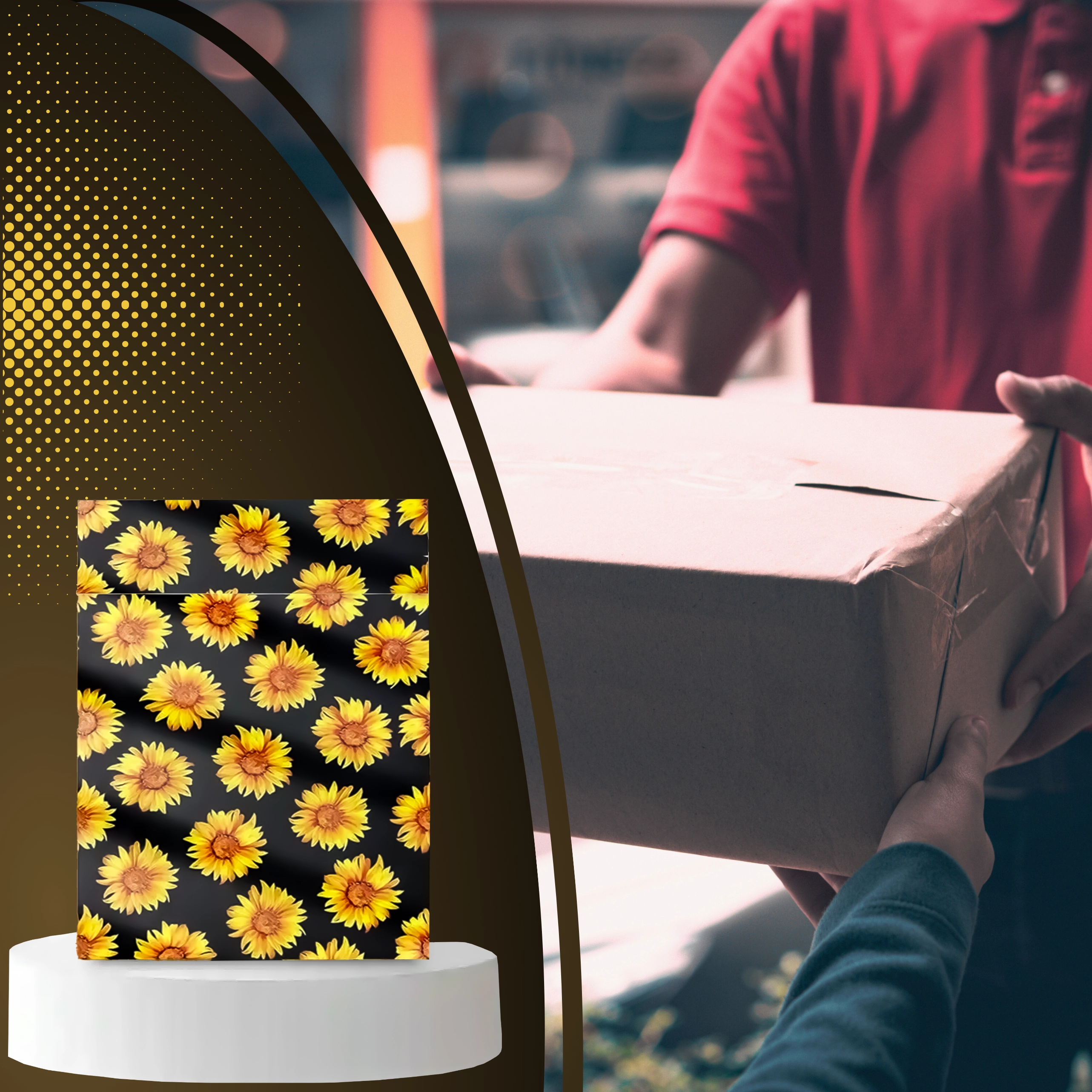 Štýlová potlač slnečníc na čiernom pozadí zlepšuje zákaznícky dojem a robí z každej zásielky malý darček.