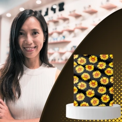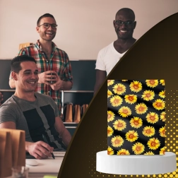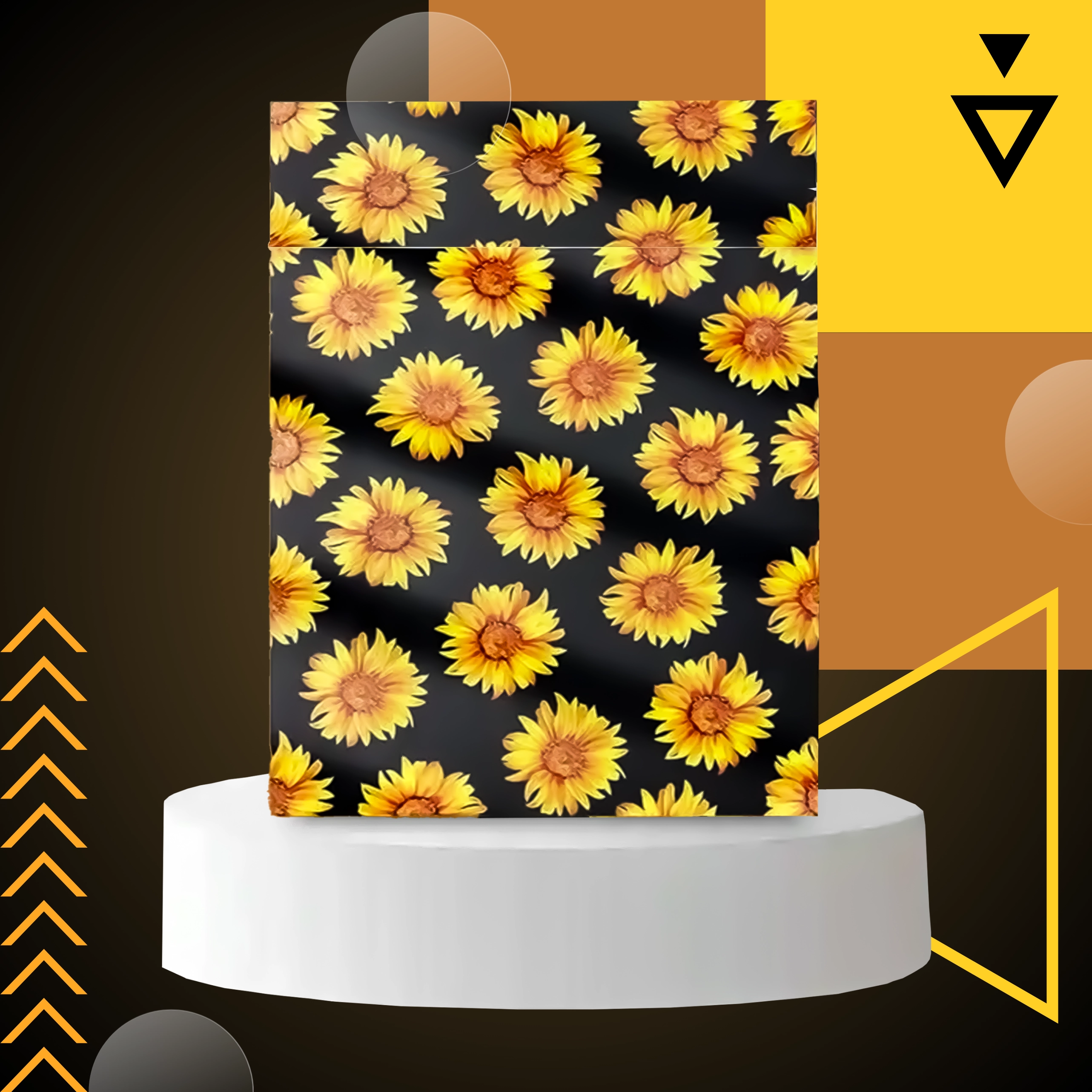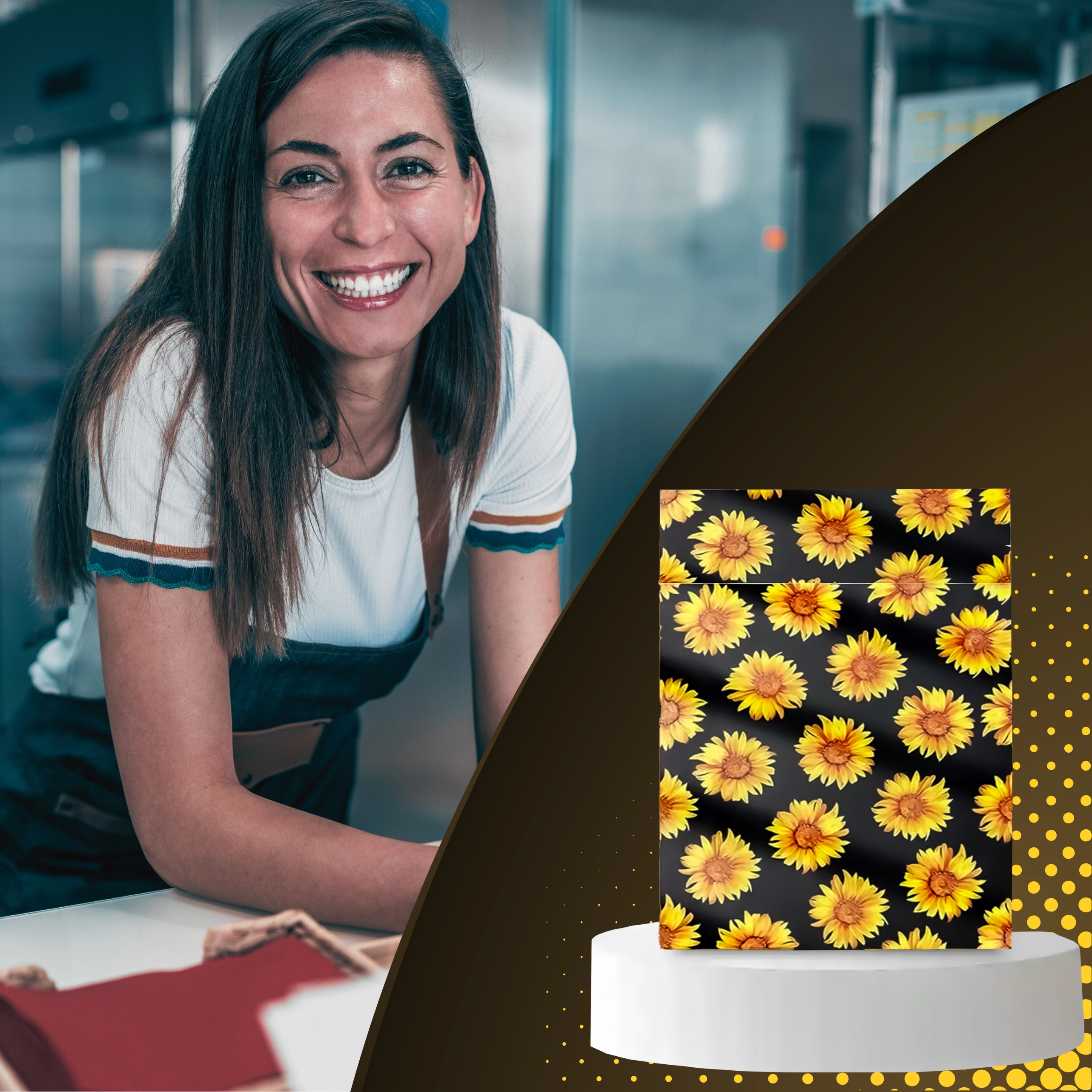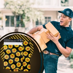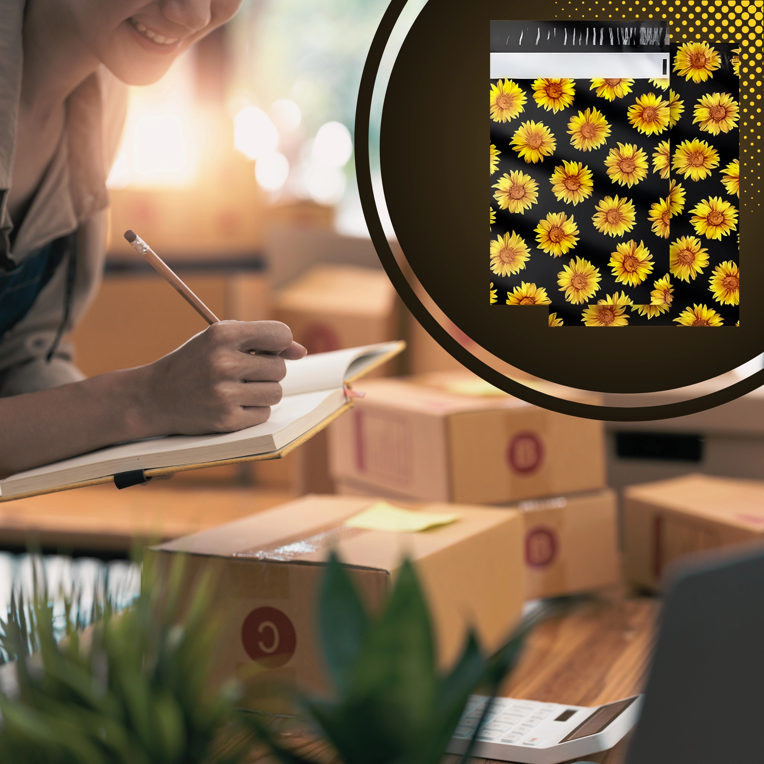 Štýlová potlač slnečníc na čiernom pozadí zlepšuje zákaznícky dojem a robí z každej zásielky malý darček.